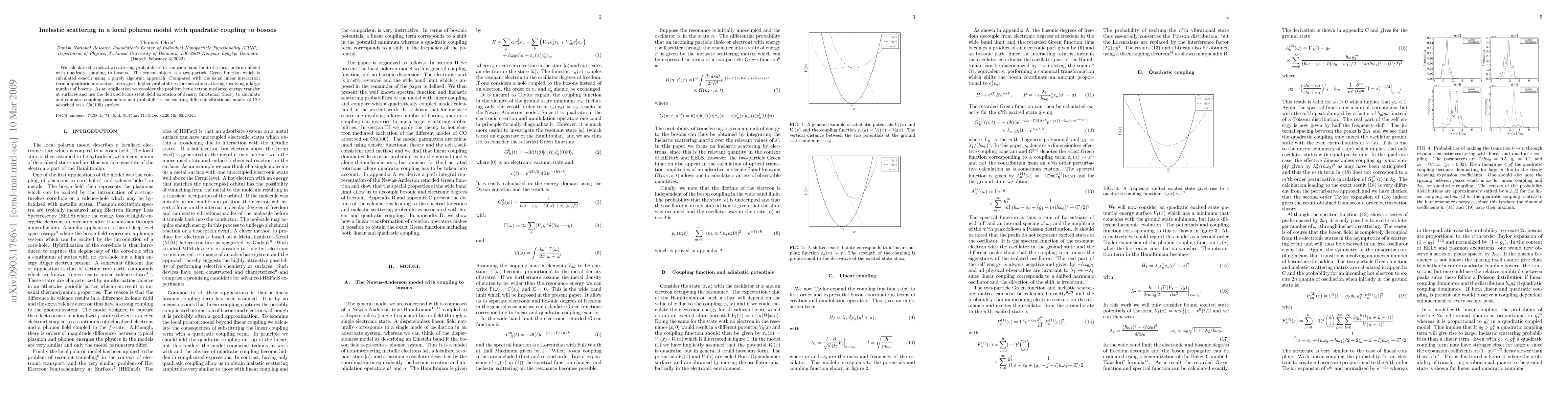 We calculate the inelastic scattering probabilities in the wide band limit of a local polaron model with quadratic coupling to bosons. The central object is a two-particle Green function which is calculated exactly using a purely algebraic approach. Compared with the usual linear interaction term a quadratic interaction term gives higher probabilities for inelastic scattering involving a large number of bosons. As an application we consider the problem hot electron mediated energy transfer at surfaces and use the delta self-consistent field extension of density functional theory to calculate and compare coupling parameters and probabilities for exciting different vibrational modes of CO adsorbed on a Cu(100) surface.
