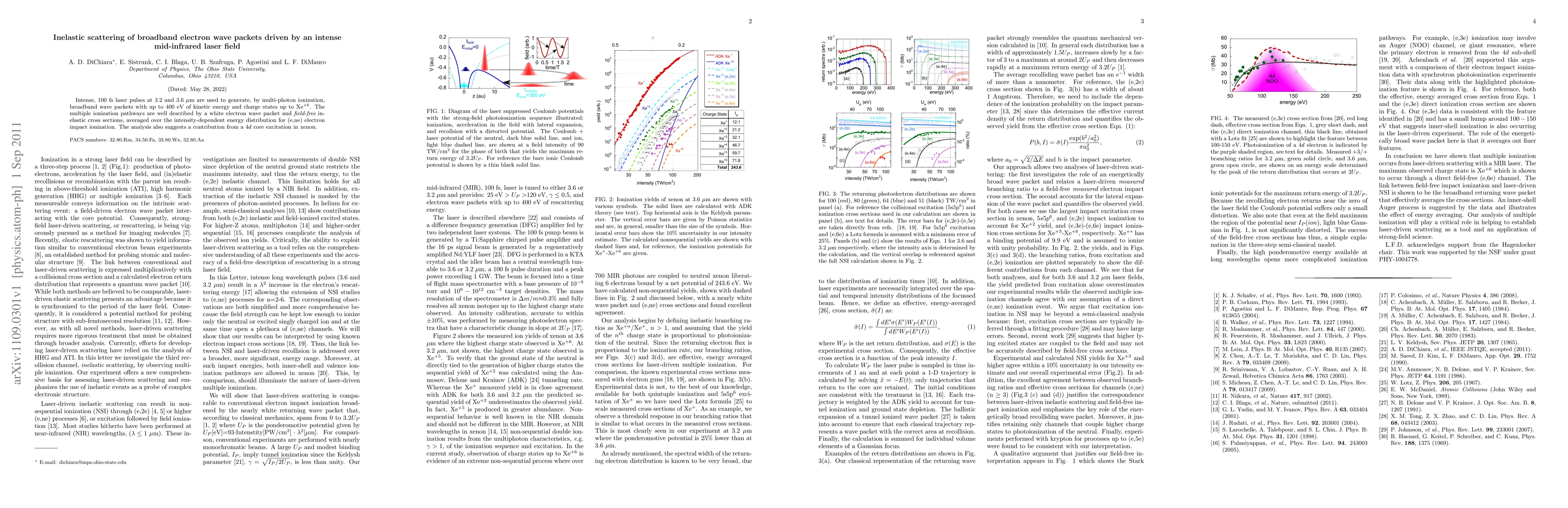 This paper investigates the inelastic scattering of broadband electron wave packets generated by intense mid-infrared laser pulses, showing multi-photon ionization pathways and high charge states up to Xe+6. The study uses a white electron wave packet model and field-free inelastic cross sections to describe the ionization processes, with additional evidence of 4d core excitation in xenon.