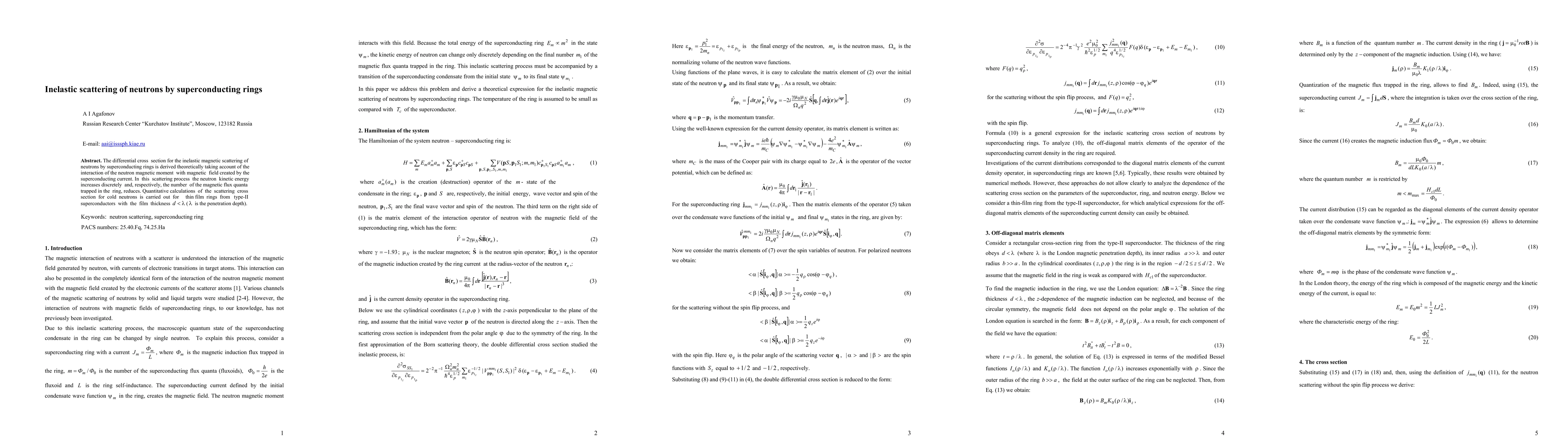 This paper theoretically derives the differential cross section for inelastic magnetic scattering of neutrons by superconducting rings, considering the interaction between the neutron's magnetic moment and the magnetic field from the superconducting current. It quantifies the scattering cross section for cold neutrons in thin film type-II superconducting rings where the film thickness is less than the penetration depth.