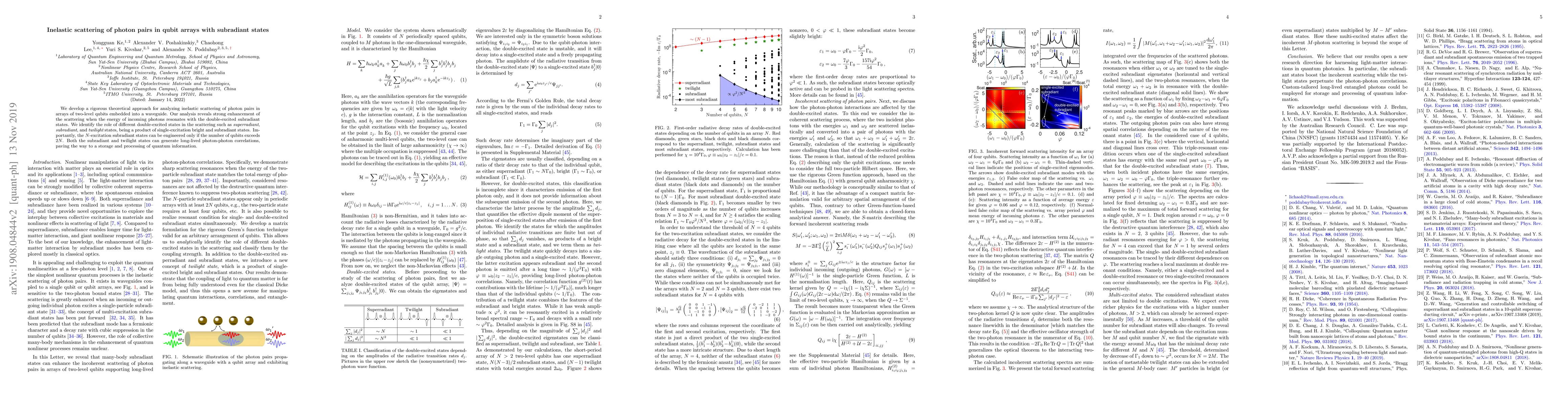 This paper presents a theoretical framework for analyzing inelastic scattering of photon pairs in qubit arrays, highlighting significant enhancement when photon energy matches double-excited subradiant states. It identifies the roles of various double-excited states and notes that N-excitation subradiant states require more than 2N qubits, with subradiant and twilight states enabling long-lived photon-photon correlations for quantum information storage and processing.