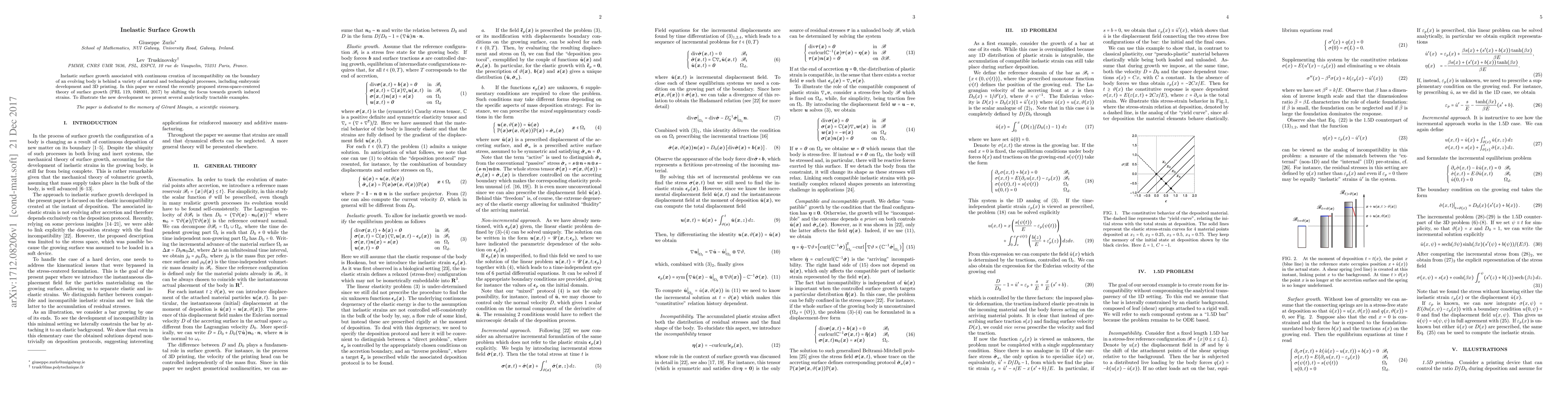 Inelastic surface growth associated with continuous creation of incompatibility on the boundary of an evolving body is behind a variety of natural and technological processes, including embryonic development and 3D printing. In this paper we extend the recently proposed stress-space-centered theory of surface growth (PRL 119, 048001, 2017) by shifting the focus towards growth induced strains. To illustrate the new development we present several analytically tractable examples.