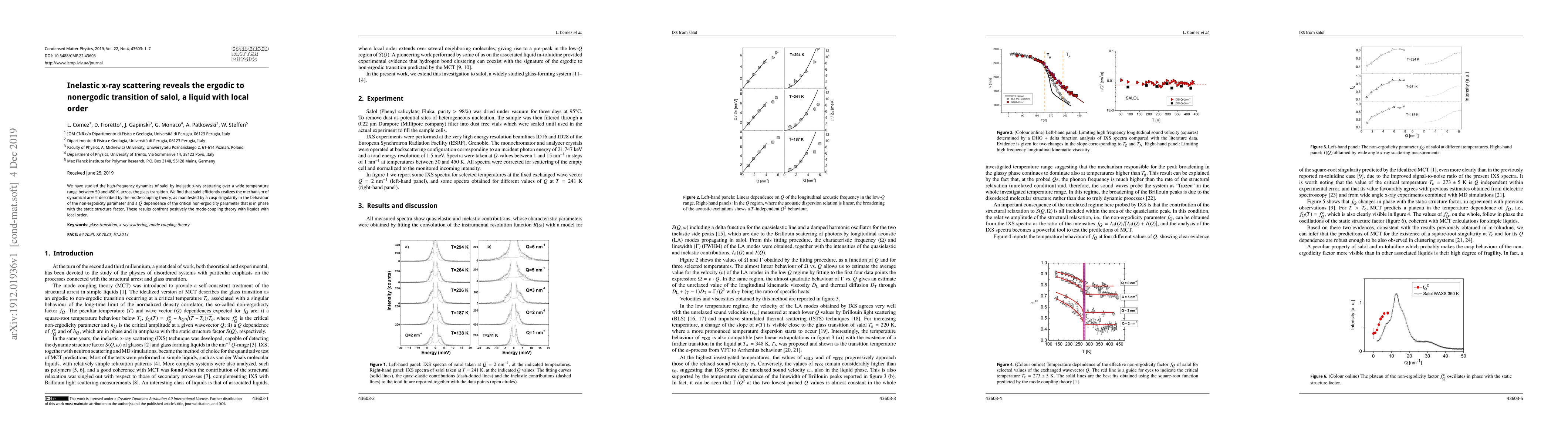 We have studied the high-frequency dynamics of salol by inelastic x-ray scattering over a wide temperature range between 50 and 450 K, across the glass transition. We find that salol efficiently realizes the mechanism of dynamical arrest described by the mode-coupling theory, as manifested by a cusp singularity in the behaviour of the non-ergodicity parameter and a $Q$ dependence of the critical non-ergodicity parameter that is in phase with the static structure factor. These results confront positively the mode-coupling theory with liquids with local order.