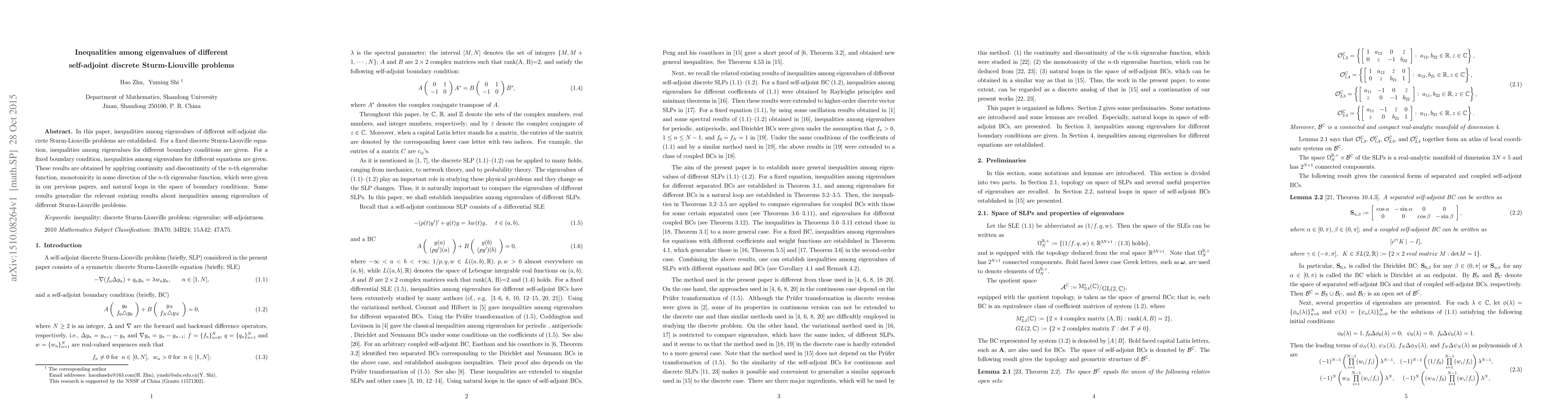 This paper establishes inequalities among eigenvalues for different self-adjoint discrete Sturm-Liouville problems, considering both varying boundary conditions and equations. The results leverage previous findings on the continuity and discontinuity of eigenvalue functions, their monotonicity, and natural loops in boundary condition spaces.