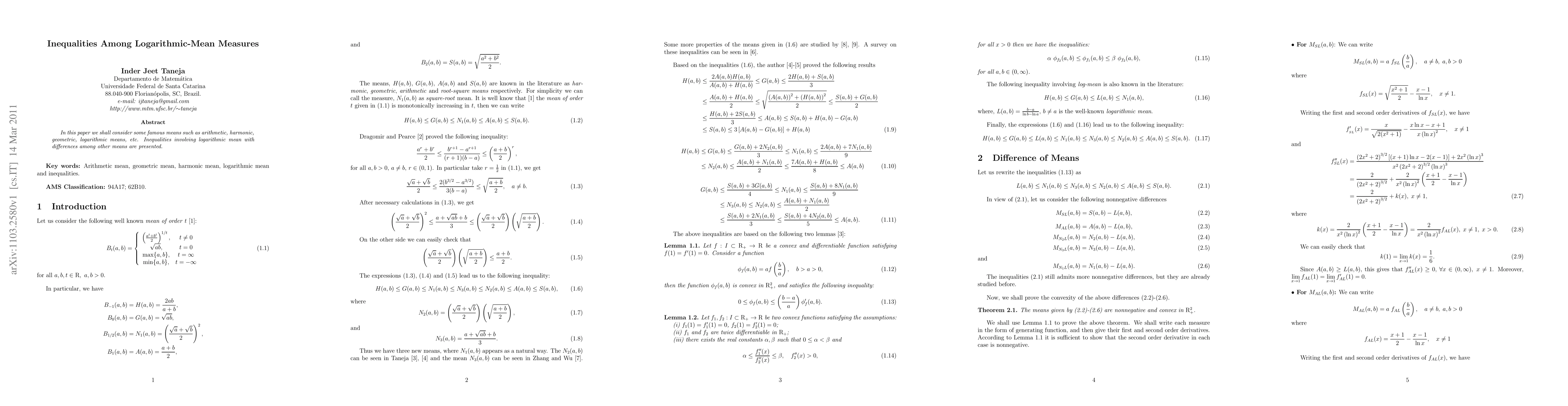 Summary: This paper explores inequalities involving the logarithmic mean and compares it with other well-known means like arithmetic, harmonic, and geometric means. It presents significant differences and relationships among these logarithmic-mean measures.