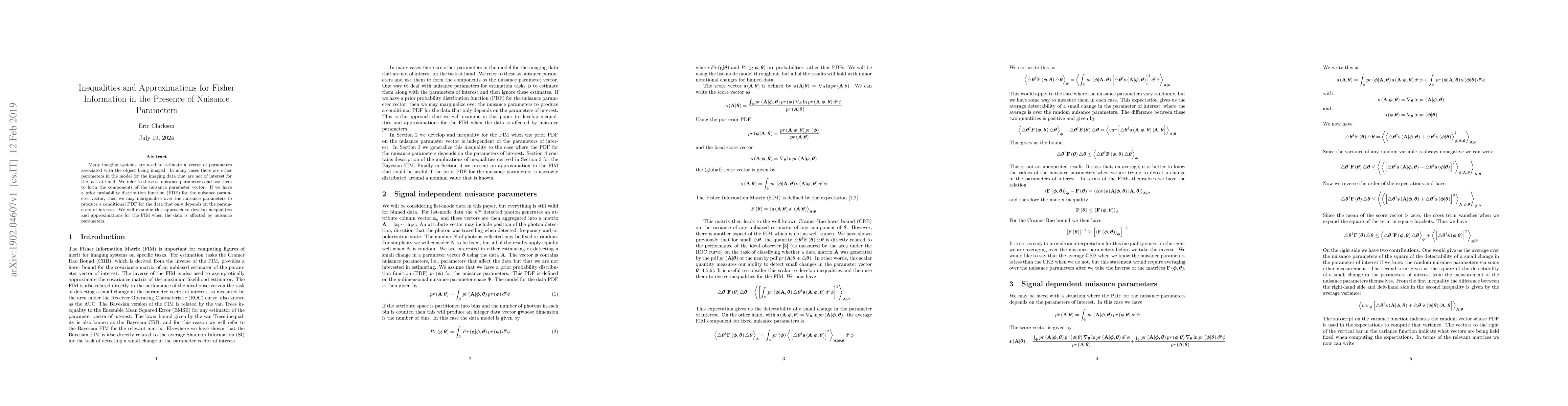 This paper investigates methods to develop inequalities and approximations for the Fisher Information Matrix (FIM) when imaging data includes nuisance parameters. The study focuses on marginalizing over nuisance parameters using a prior distribution to obtain a conditional PDF that depends only on the parameters of interest.
