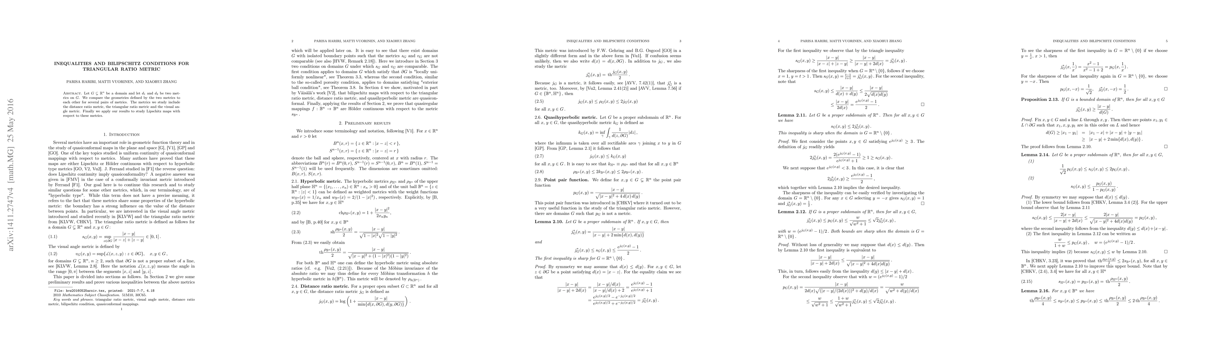 This paper investigates geometric comparisons between various metrics on a domain $G \subsetneq \mathbb{R}^n$, focusing on the distance ratio, triangular ratio, and visual angle metrics. It also examines bilipschitz conditions and Lipschitz maps concerning these metrics.