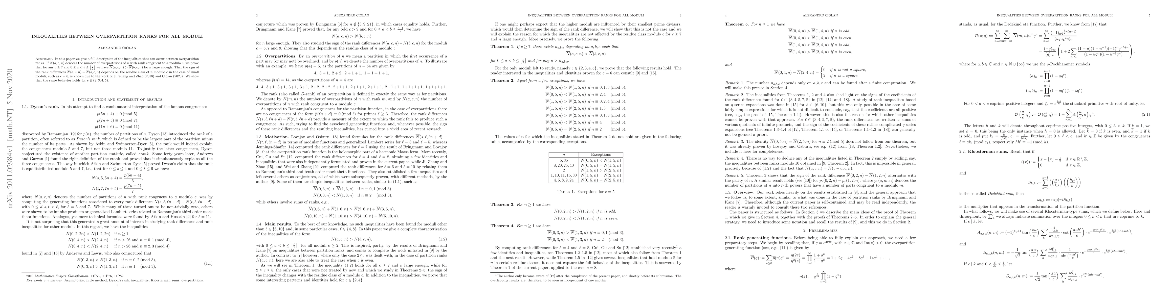 In this paper we give a full description of the inequalities that can occur between overpartition ranks. If $ \overline{N}(a,c,n) $ denotes the number of overpartitions of $ n $ with rank congruent to $ a $ modulo $ c,$ we prove that for any $ c\ge7 $ and $ 0\le a\overline{N}(b,c,n) $ for $n$ large enough. That the sign of the rank differences $ \overline{N}(a,c,n)-\overline{N}(b,c,n) $ depends on the residue class of $ n $ modulo $ c $ in the case of small moduli, such as $ c=6, $ is known due to the work of Ji, Zhang and Zhao (2018) and Ciolan (2020). We show that the same behavior holds for $ c\in\{2,3, 4,5\}. $