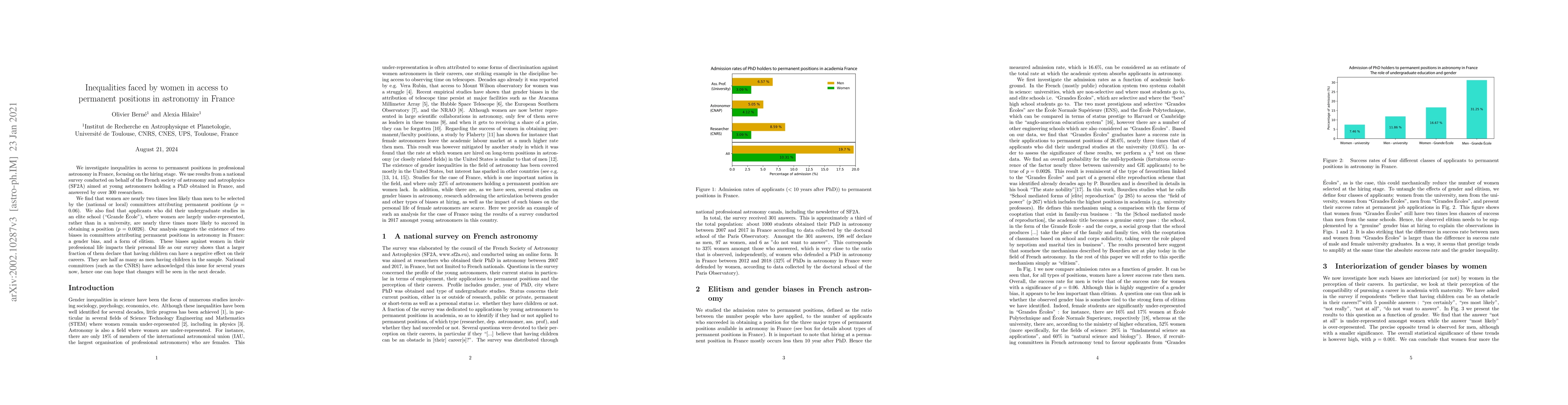 We investigate inequalities in access to permanent positions in professional astronomy in France, focusing on the hiring stage. We use results from a national survey conducted on behalf of the French society of astronomy and astrophysics (SF2A) aimed at young astronomers holding a PhD obtained in France, and answered by over 300 researchers. We find that women are nearly two times less likely than men to be selected by the (national or local) committees attributing permanent positions ($p=0.06$). We also find that applicants who did their undergraduate studies in an elite school ("Grande \'Ecole"), where women are largely under-represented, rather than in a university, are nearly three times more likely to succeed in obtaining a position ($p=0.0026$). Our analysis suggests the existence of two biases in committees attributing permanent positions in astronomy in France: a gender bias, and a form of elitism. These biases against women in their professional life impacts their personal life as our survey shows that a larger fraction of them declare that having children can have a negative effect on their careers. They are half as many as men having children in the sample. National committees (such as the CNRS) have acknowledged this issue for several years now, hence one can hope that changes will be seen in the next decade.