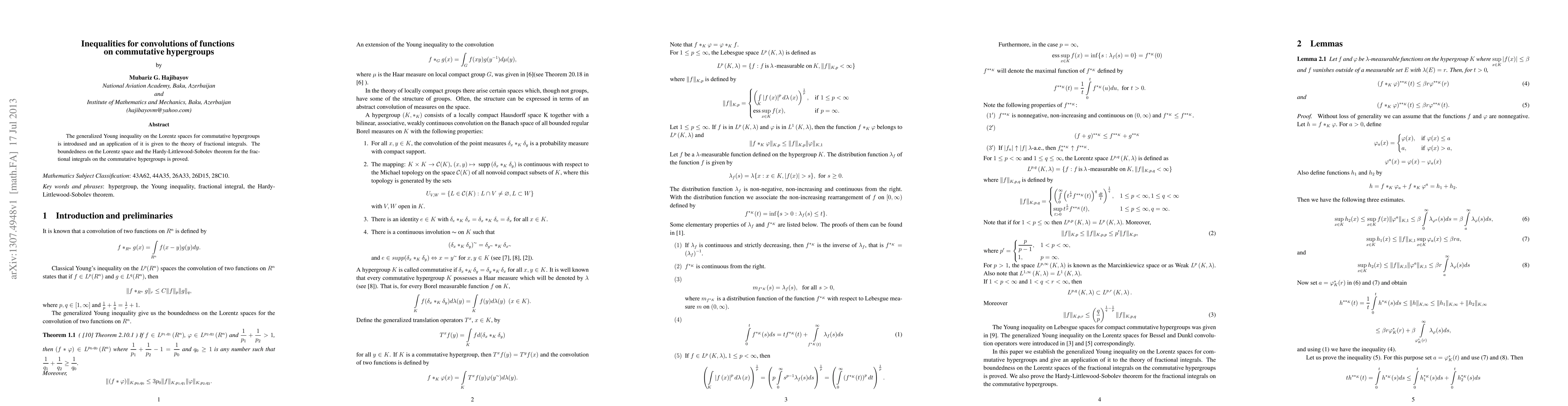 This paper introduces the generalized Young inequality for convolutions on commutative hypergroups and applies it to establish the boundedness of fractional integrals on Lorentz spaces, proving the Hardy-Littlewood-Sobolev theorem in this context.