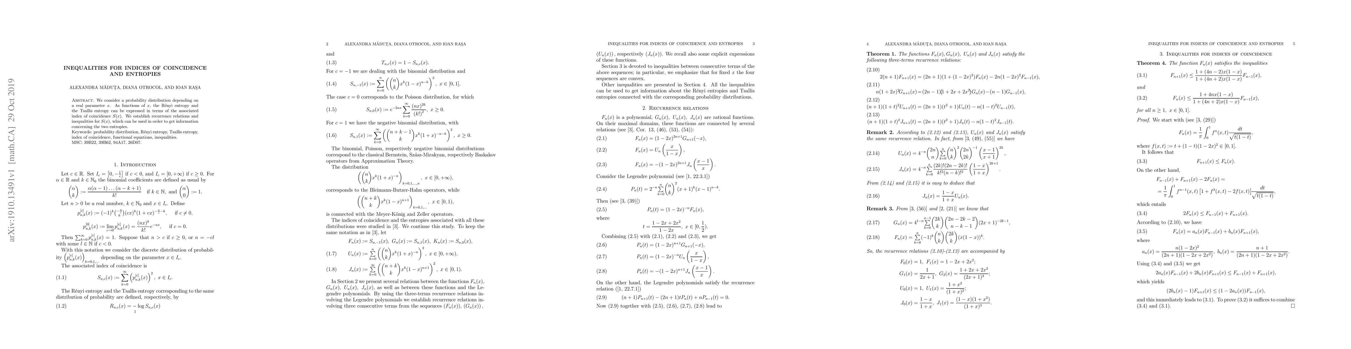 The recurrence relations for Fn(x), Gn(x), Un(x), and Jn(x) provide a new theoretical framework for understanding indices of coincidence and entropies.