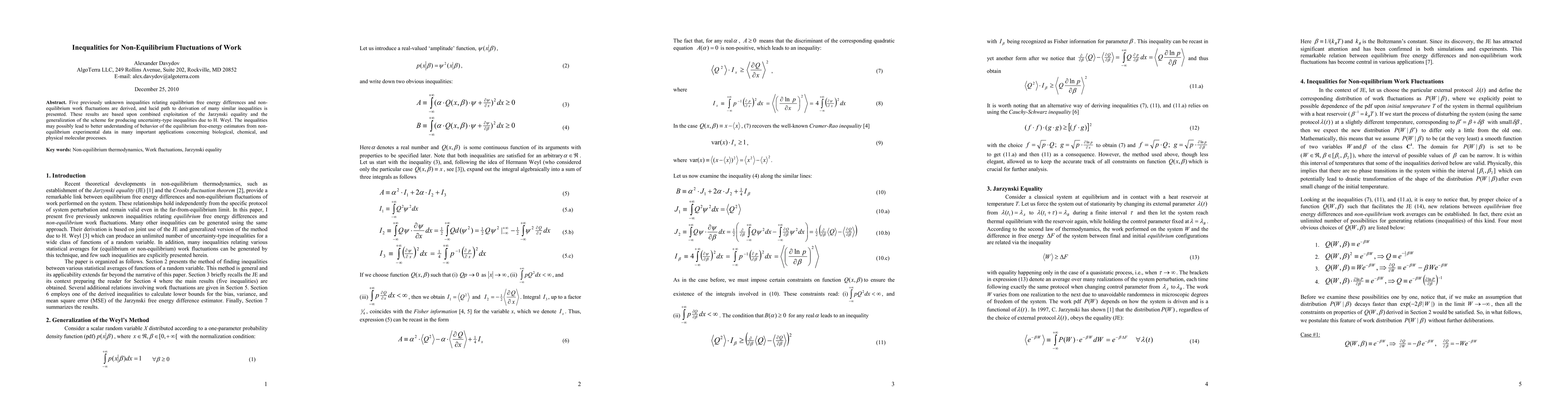 Five previously unknown inequalities relating equilibrium free energy differences and non-equilibrium work fluctuations are derived, and lucid path to derivation of many similar inequalities is presented. These results are based upon combined exploitation of the Jarzynski equality and the generalization of the scheme for producing uncertainty-type inequalities due to H. Weyl. The inequalities may possibly lead to better understanding of behavior of the equilibrium free-energy estimators from non-equilibrium experimental data in many important applications concerning biological, chemical, and physical molecular processes.