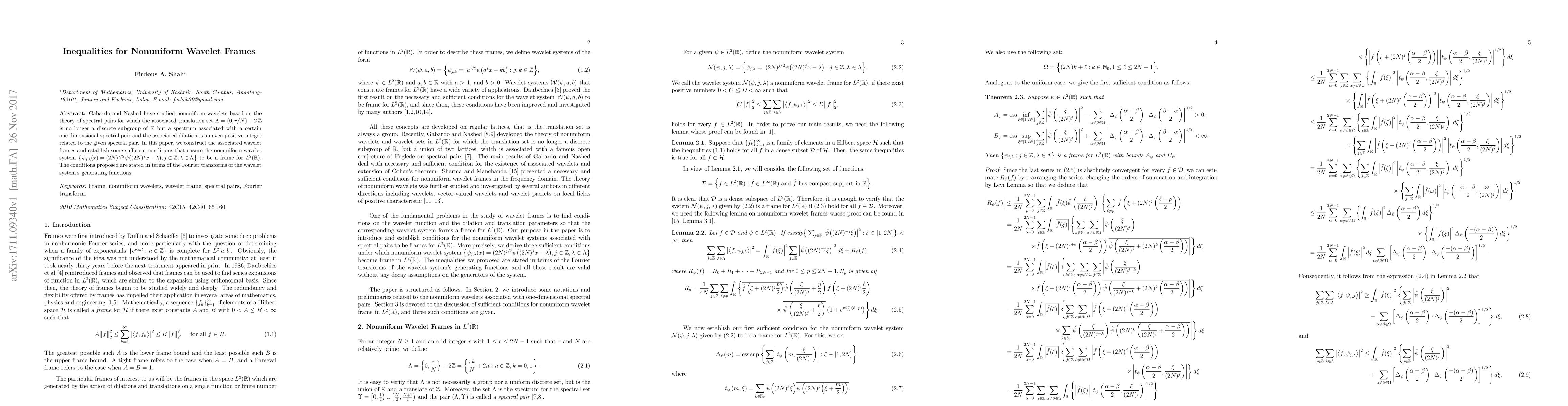 Gabardo and Nashed have studied nonuniform wavelets based on the theory of spectral pairs for which the associated translation set $\Lambda =\left\{ 0,r/N\right\}+2\,\mathbb Z$ is no longer a discrete subgroup of $\mathbb R$ but a spectrum associated with a certain one-dimensional spectral pair and the associated dilation is an even positive integer related to the given spectral pair. In this paper, we construct the associated wavelet frames and establish some sufficient conditions that ensure the nonuniform wavelet system $\left\{ \psi_{j, \lambda}(x)= (2N)^{j/2}\psi\big( (2N)^{j}x-\lambda\big), j\in \mathbb Z, \lambda\in \Lambda \right\}$ to be a frame for $L^2(\mathbb R)$. The conditions proposed are stated in terms of the Fourier transforms of the wavelet system's generating functions.