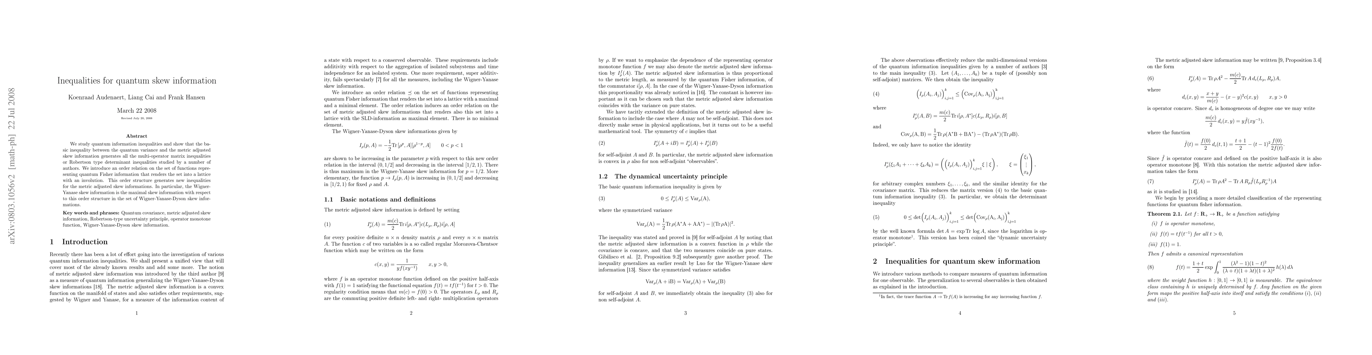 We study quantum information inequalities and show that the basic inequality between the quantum variance and the metric adjusted skew information generates all the multi-operator matrix inequalities or Robertson type determinant inequalities studied by a number of authors. We introduce an order relation on the set of functions representing quantum Fisher information that renders the set into a lattice with an involution. This order structure generates new inequalities for the metric adjusted skew informations. In particular, the Wigner-Yanase skew information is the maximal skew information with respect to this order structure in the set of Wigner-Yanase-Dyson skew informations. Key words and phrases: Quantum covariance, metric adjusted skew information, Robertson-type uncertainty principle, operator monotone function, Wigner-Yanase-Dyson skew information.