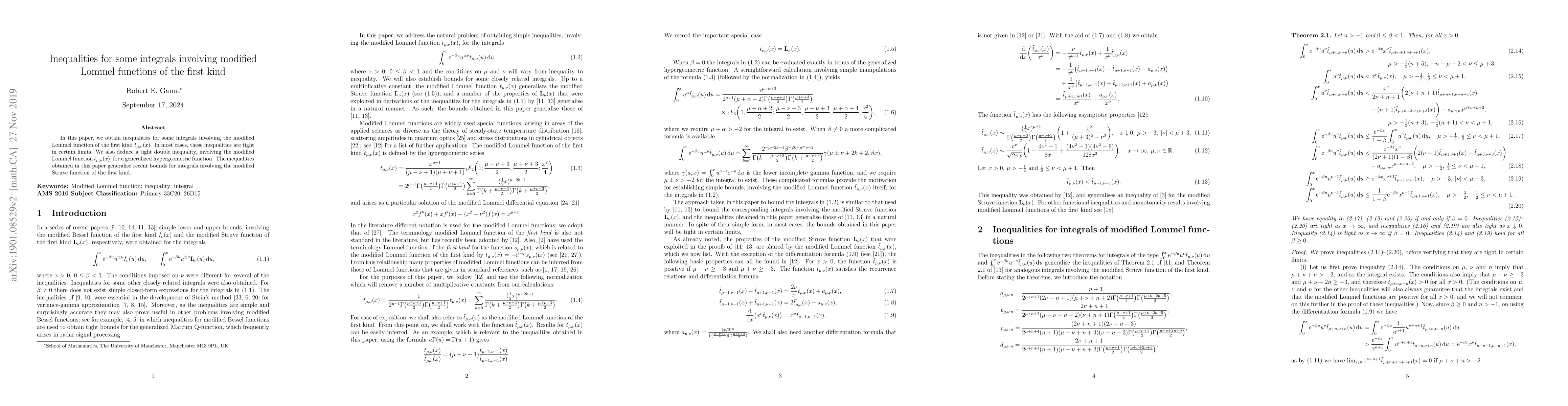 This paper establishes tight inequalities for integrals involving the modified Lommel function of the first kind $t_{\mu,\nu}(x)$, extending recent bounds for integrals with the modified Struve function. A notable result includes a tight double inequality involving the modified Lommel function and a generalized hypergeometric function.