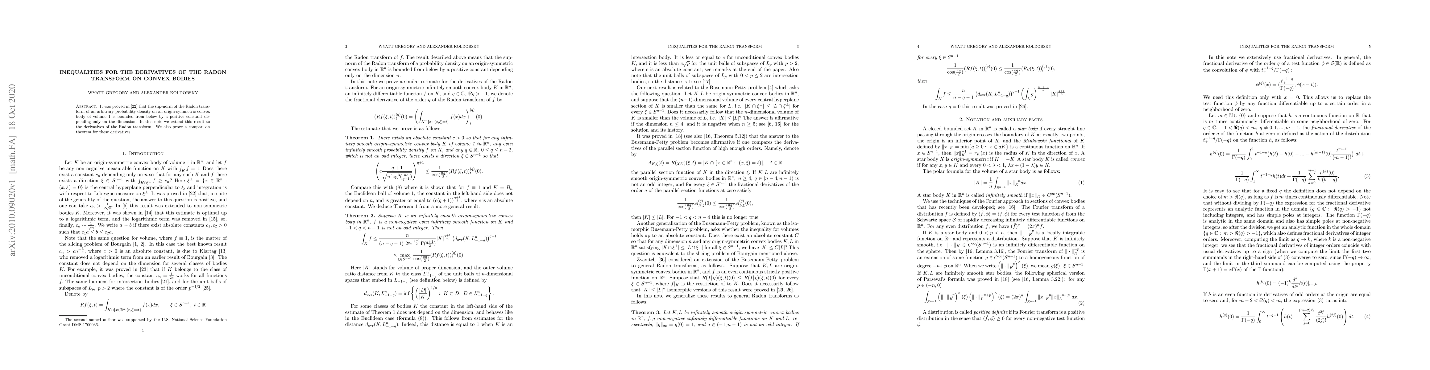 This paper extends the lower bound for the Radon transform of probability densities on convex bodies to its derivatives, establishing a positive constant dependency on dimension. Additionally, it introduces a comparison theorem for these derivative inequalities.