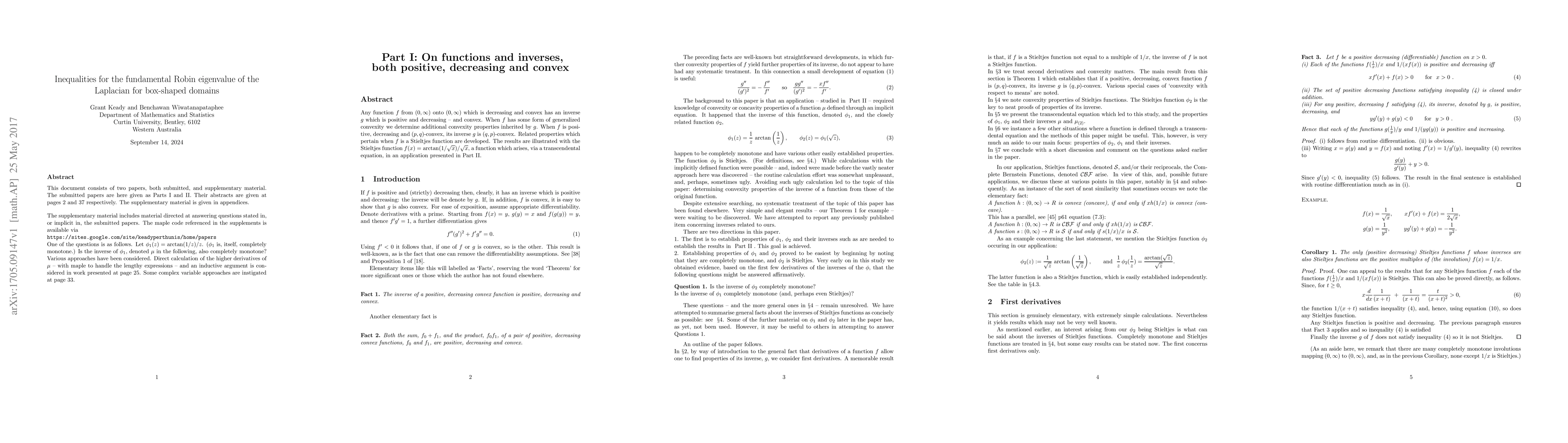 This document consists of two papers, both submitted, and supplementary material. The submitted papers are here given as Parts I and II. Part I establishes results, used in Part II, 'on functions and inverses, both positive, decreasing and convex'. Part II uses results from Part I to extablish 'inequalities for the fundamental Robin eigenvalue for the Laplacian on N-dimensional boxes'