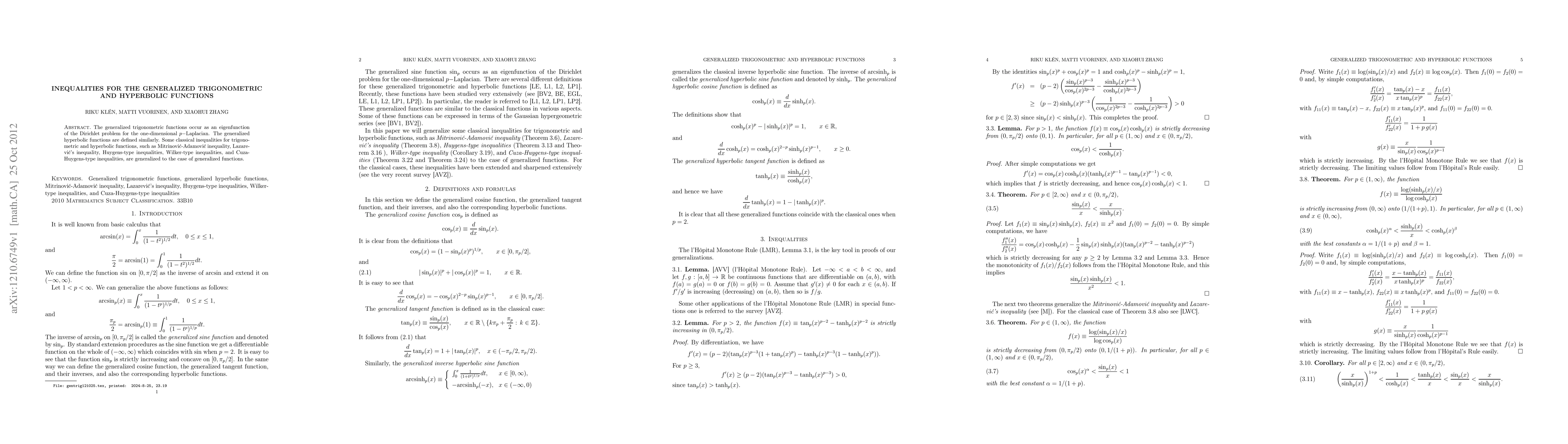 The generalized trigonometric functions occur as an eigenfunction of the Dirichlet problem for the one-dimensional $p-$Laplacian. The generalized hyperbolic functions are defined similarly. Some classical inequalities for trigonometric and hyperbolic functions, such as Mitrinovi\'c-Adamovi\'c inequality, Lazarevi\'c's inequality, Huygens-type inequalities, Wilker-type inequalities, and Cuza-Huygens-type inequalities, are generalized to the case of generalized functions.