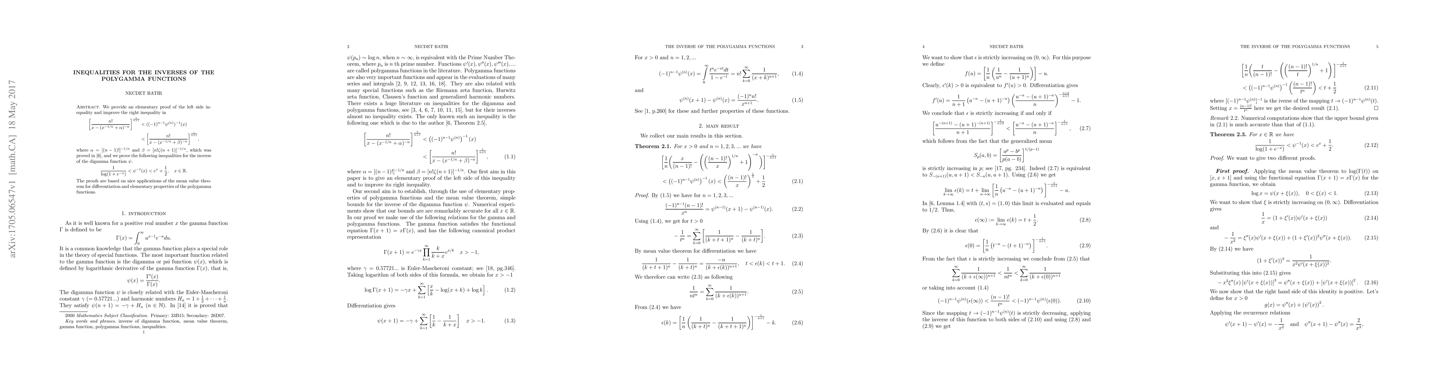 We provide an elementary proof of the left side inequality and improve the right inequality in \bigg[\frac{n!}{x-(x^{-1/n}+\alpha)^{-n}}\bigg]^{\frac{1}{n+1}}&<((-1)^{n-1}\psi^{(n)})^{-1}(x) &<\bigg[\frac{n!}{x-(x^{-1/n}+\beta)^{-n}}\bigg]^{\frac{1}{n+1}}, where $\alpha=[(n-1)!]^{-1/n}$ and $\beta=[n!\zeta(n+1)]^{-1/n}$, which was proved in \cite{6}, and we prove the following inequalities for the inverse of the digamma function $\psi$. \frac{1}{\log(1+e^{-x})}<\psi^{-1}(x)< e^{x}+\frac{1}{2}, \quad x\in\mathbb{R}. The proofs are based on nice applications of the mean value theorem for differentiation and elementary properties of the polygamma functions.