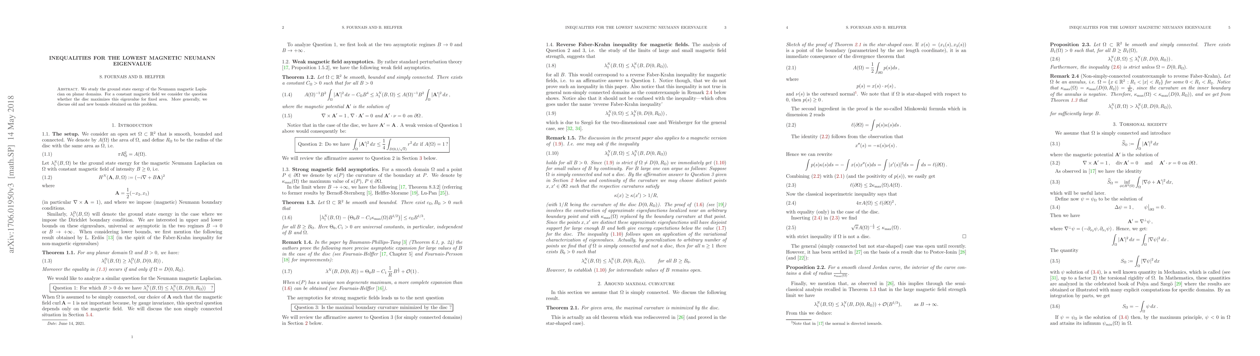 We study the ground state energy of the Neumann magnetic Laplacian on planar domains. For a constant magnetic field we consider the question whether, under an assumption of fixed area, the disc maximizes this eigenvalue. More generally, we discuss old and new bounds obtained on this problem.