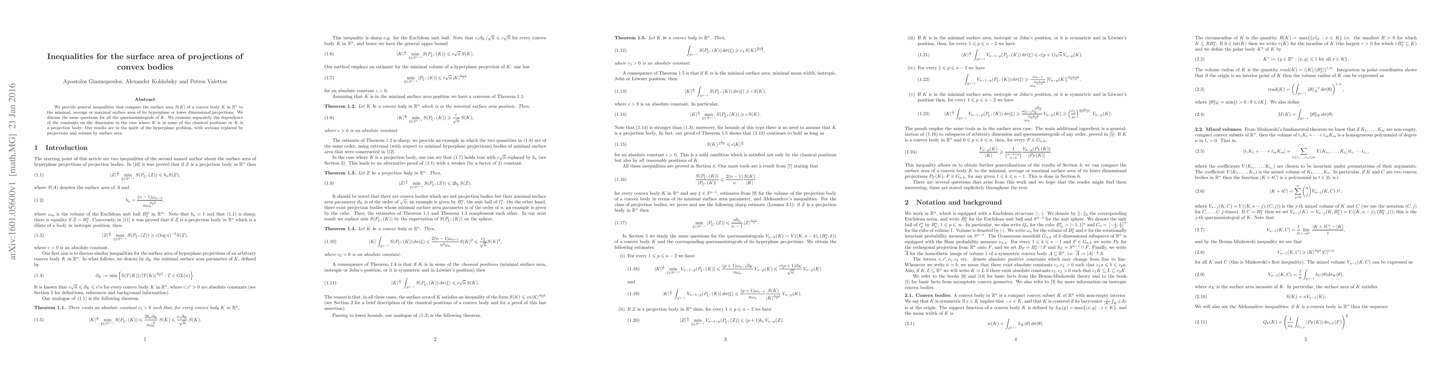This paper establishes inequalities relating the surface area of a convex body in ${\mathbb R}^n$ to the surface areas of its projections onto hyperplanes and lower dimensions. It also explores the dependence of these constants on the dimension, particularly for classical positions and projection bodies.