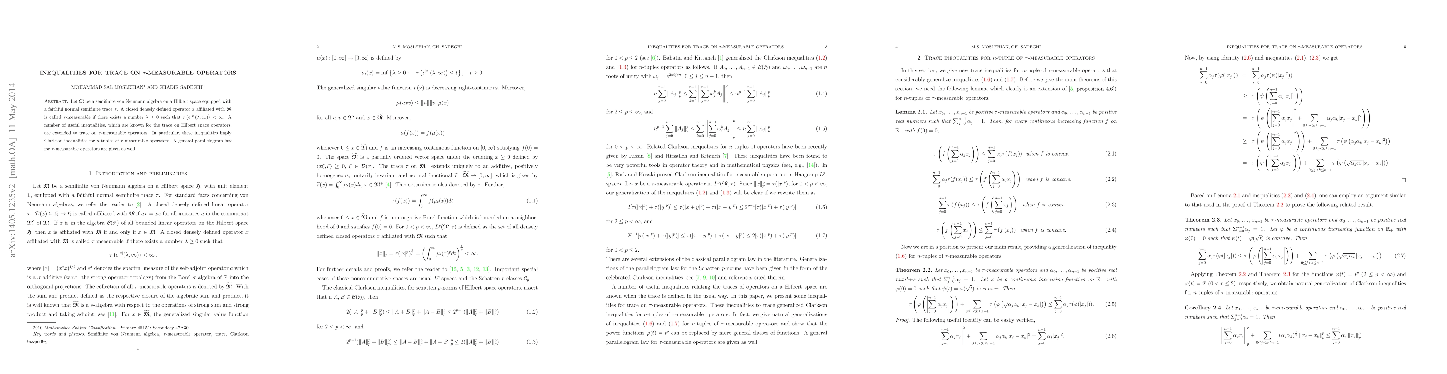 Let $\mathfrak{M}$ be a semifinite von Neumann algebra on a Hilbert space equipped with a faithful normal semifinite trace $\tau$. A closed densely defined operator $x$ affiliated with $\mathfrak{M}$ is called $\tau$-measurable if there exists a number $\lambda \geq 0$ such that $\tau \left(e^{|x|}(\lambda,\infty)\right)<\infty$. A number of useful inequalities, which are known for the trace on Hilbert space operators, are extended to trace on $\tau$-measurable operators. In particular, these inequalities imply Clarkson inequalities for $n$-tuples of $\tau$-measurable operators. A general parallelogram law for $\tau$-measurable operators are given as well.