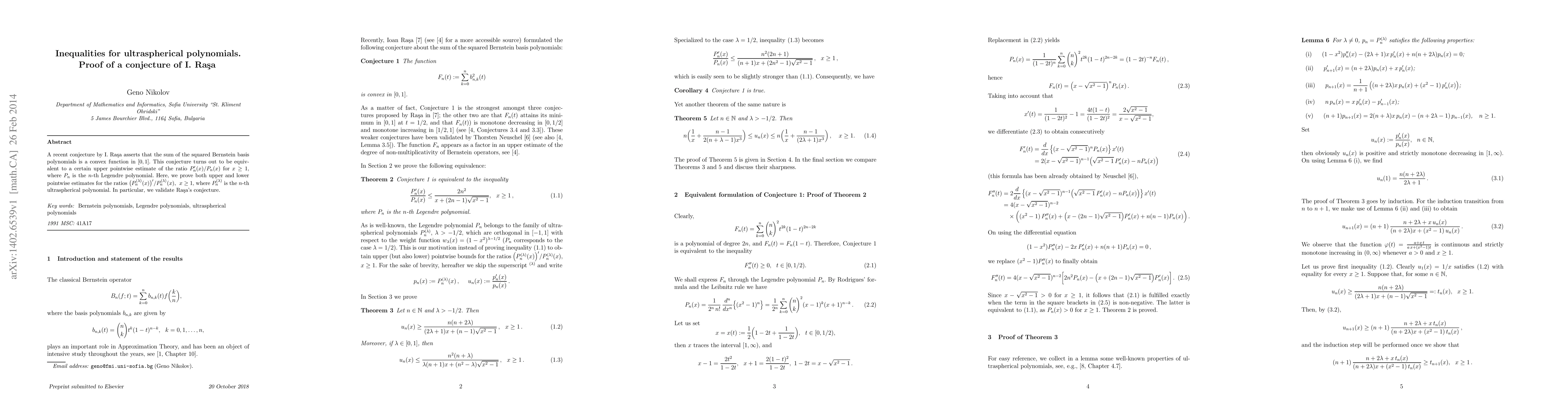 A recent conjecture by I. Ra\c{s}a asserts that the sum of the squared Bernstein basis polynomials is a convex function in $[0,1]$. This conjecture turns out to be equivalent to a certain upper pointwise estimate of the ratio $P_n^{\prime}(x)/P_n(x)$ for $x\geq 1$, where $P_n$ is the $n$-th Legendre polynomial. Here, we prove both upper and lower pointwise estimates for the ratios $\big(P_n^{(\lambda)}(x)\big)^{\prime}/P_n^{(\lambda)}(x)$, $~x\geq 1$, where $P_n^{(\lambda)}$ is the $n$-th ultraspherical polynomial. In particular, we validate Ra\c{s}a's conjecture.