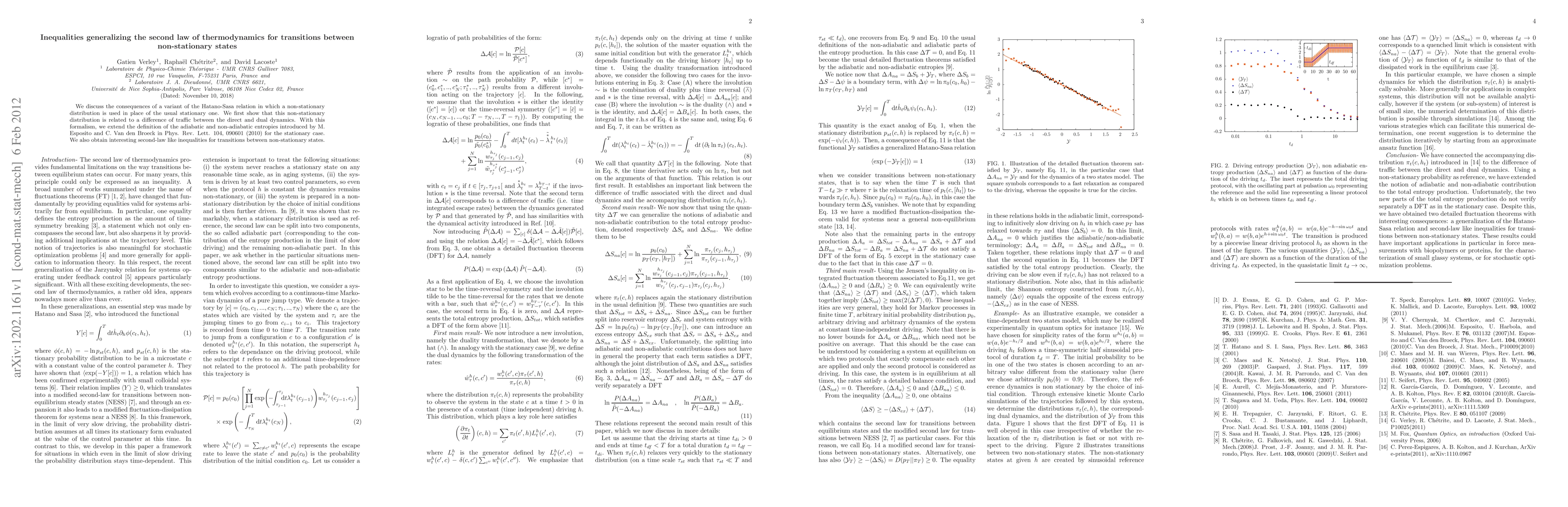This paper explores a modified version of the Hatano-Sasa relation, using non-stationary distributions instead of stationary ones. It extends the concept of adiabatic and non-adiabatic entropies, deriving new second-law like inequalities for transitions between non-stationary states, providing insights into thermodynamic processes.