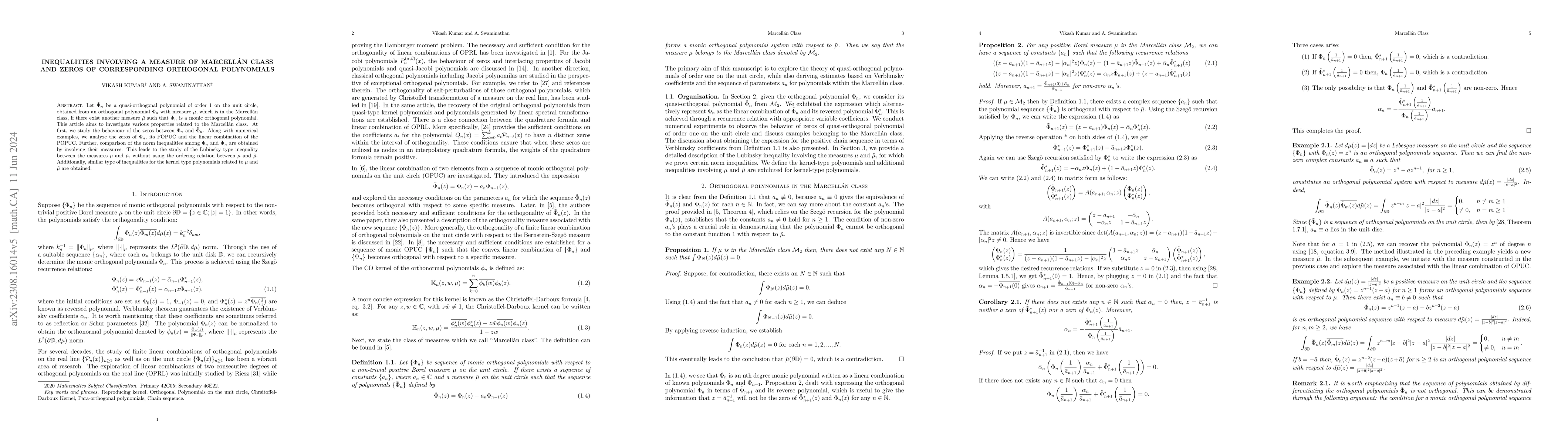 This paper explores properties of quasi-orthogonal polynomials derived from orthogonal polynomials in the Marcellán class and investigates the behavior of their zeros. It also derives norm inequalities comparing these polynomials and their measures, establishing Lubinsky-type inequalities without requiring a specific ordering between the measures.