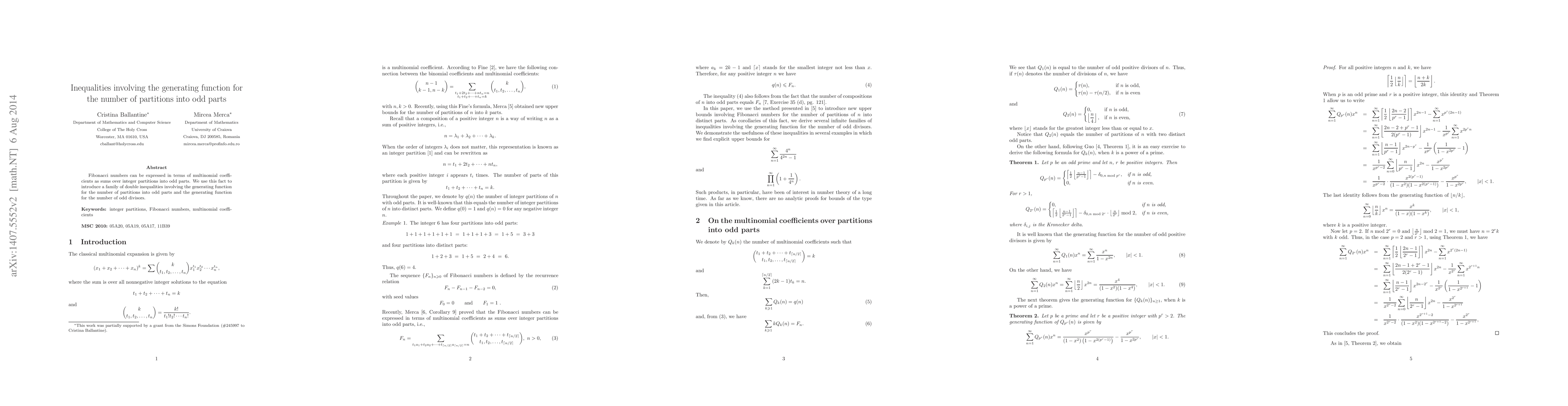 Summary: This paper explores inequalities involving the generating function for partitions into odd parts, linking them to Fibonacci numbers via multinomial coefficients, and introduces double inequalities with the generating function for odd divisors.