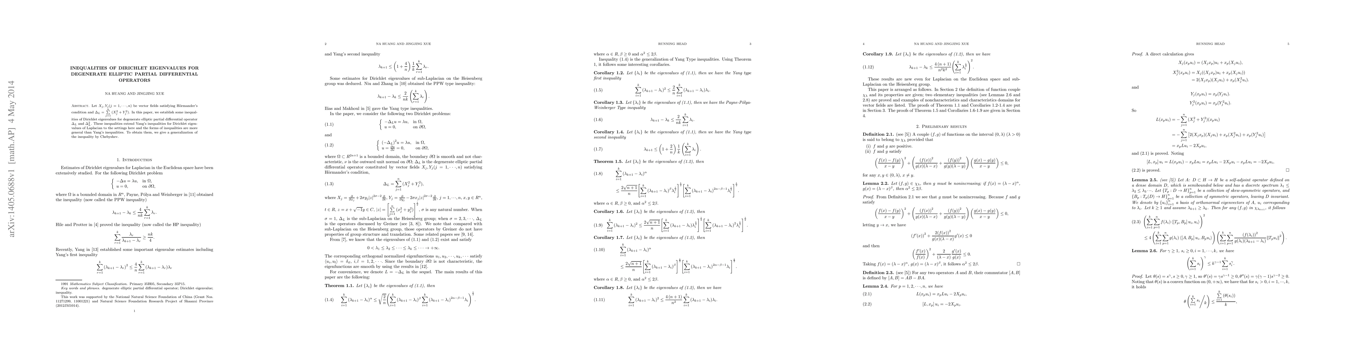 Let ${X_j},{Y_j}(j = 1, \cdot \cdot \cdot,n)$ be vector fields satisfying H\"{o}rmander's condition and ${\Delta_L} = \sum\limits_{j = 1}^n {(X_j^2 + Y_j^2)}$. In this paper, we establish some inequalities of Dirichlet eigenvalues for degenerate elliptic partial differential operator ${\Delta_L}$ and $\Delta_L^2$. These inequalities extend Yang's inequalities for Dirichlet eigenvalues of Laplacian to the settings here and the forms of inequalities are more general than Yang's inequalities. To obtain them, we give a generalization of the inequality by Chebyshev.