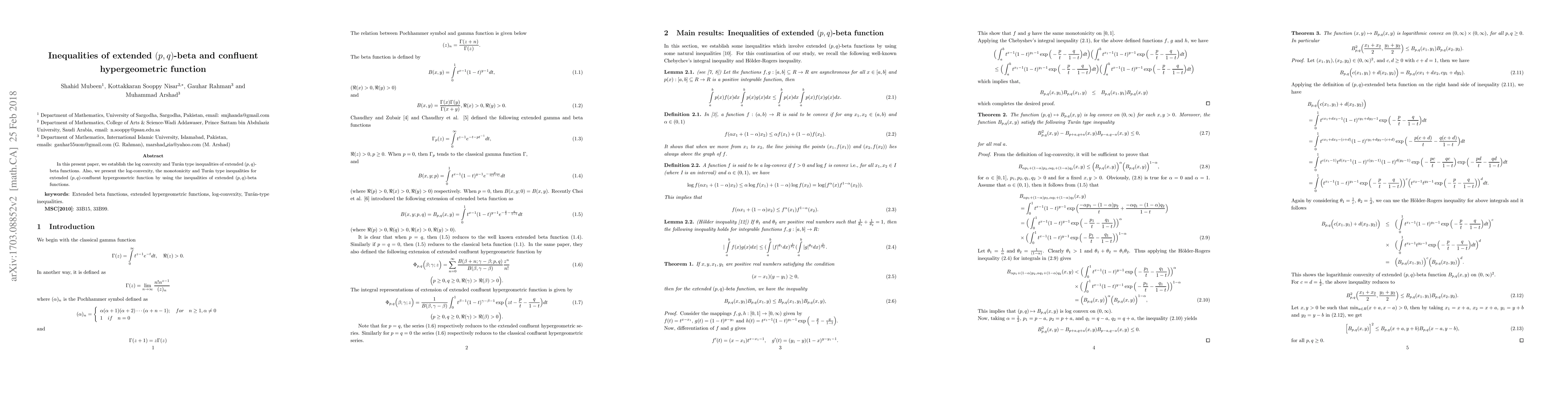 In this present paper, we establish the log-convexity and Tur\'an type inequalities of extended $(p,q)$-beta functions. Also, we present the log-convexity, the monotonicity and Tur\'an type inequalities for extended $(p,q)$-confluent hypergeometric function by using the inequalities of extended $(p,q)$-beta functions.