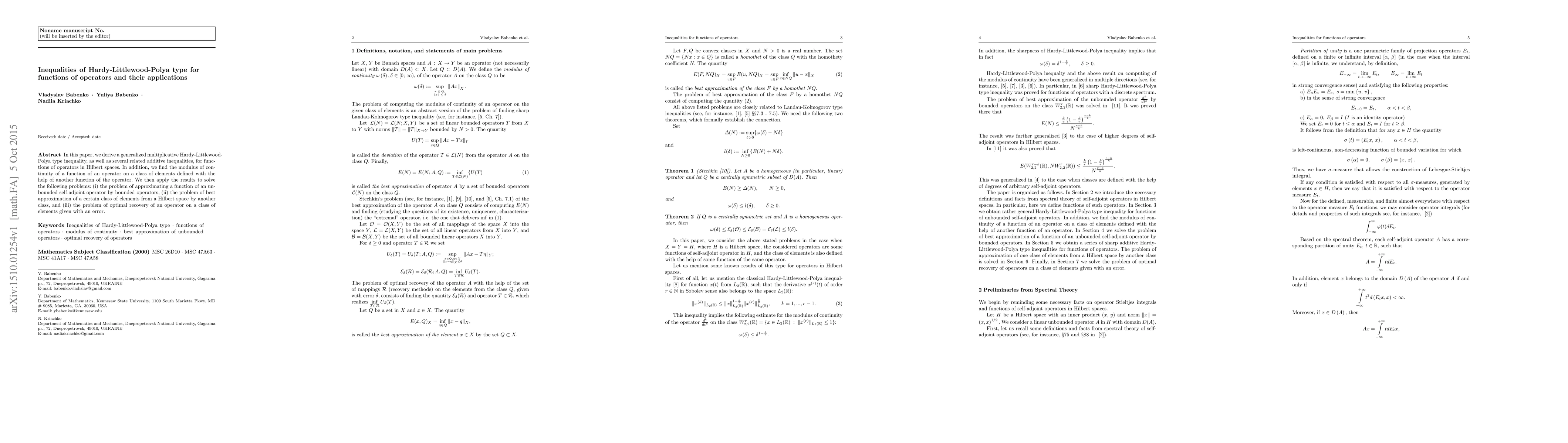 In this paper, we derive a generalized multiplicative Hardy-Littlewood-Polya type inequality, as well as several related additive inequalities, for functions of operators in Hilbert spaces. In addition, we find the modulus of continuity of a function of an operator on a class of elements defined with the help of another function of the operator. We then apply the results to solve the following problems: (i) the problem of approximating a function of an unbounded self-adjoint operator by bounded operators, (ii) the problem of best approximation of a certain class of elements from a Hilbert space by another class, and (iii) the problem of optimal recovery of an operator on a class of elements given with an error.