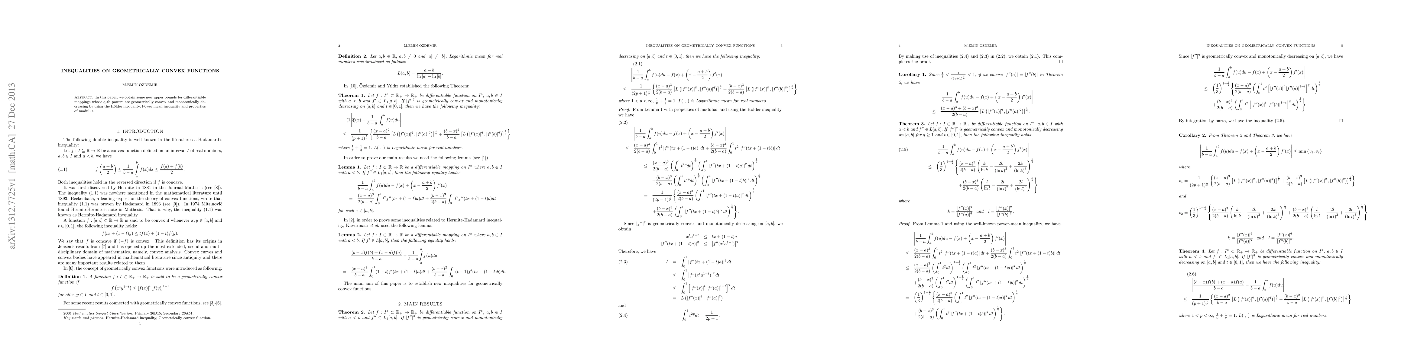 In this paper, we obtain some new upper bounds for differantiable mappings whose q-th powers are geometrically convex and monotonically decreasing by using the H\"older inequality, Power mean inequality and properties of modulus.