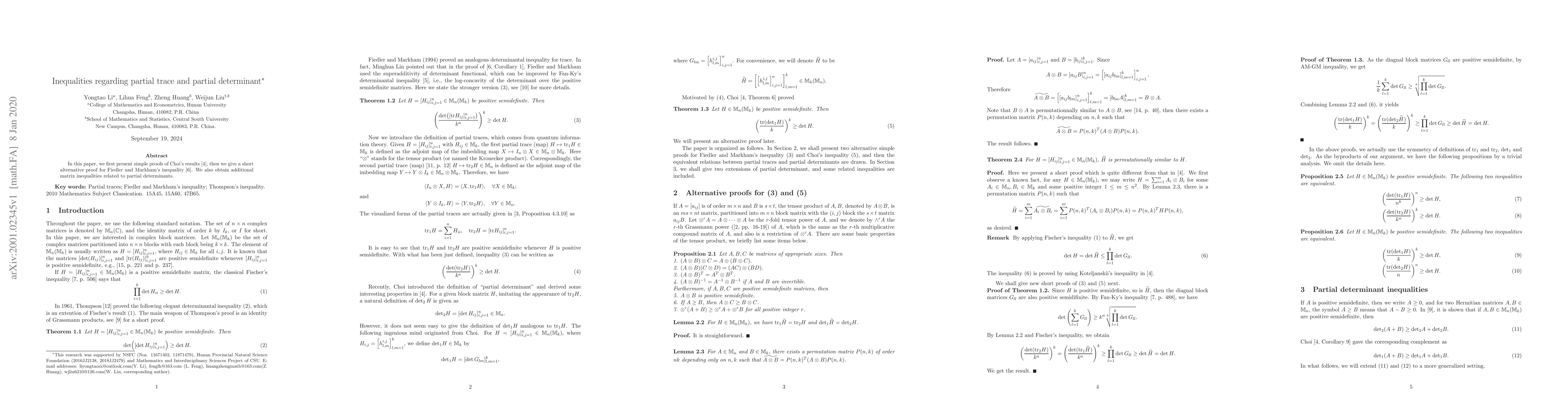 This paper provides new proofs for Choi's results and Fiedler and Markham's inequality, and introduces additional matrix inequalities concerning partial determinants. The focus is on simplifying and offering alternative proofs for established inequalities.