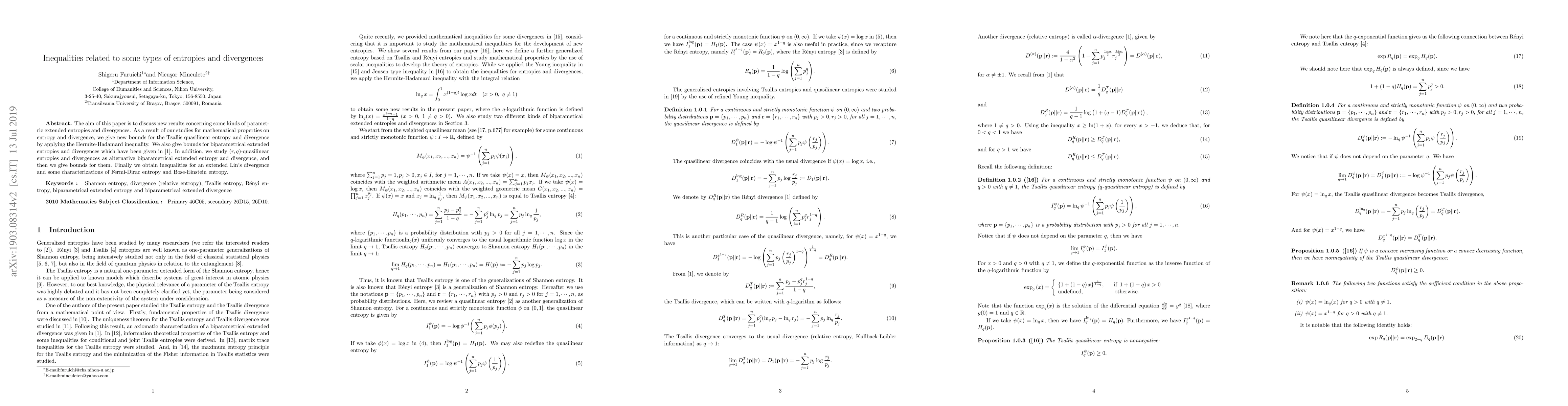 The aim of this paper is to discuss new results concerning some kinds of parametric extended entropies and divergences. As a result of our studies for mathematical properties on entropy and divergence, we give new bounds for the Tsallis quasilinear entropy and divergence by applying the Hermite-Hadamard inequality. We also give bounds for biparametrical extended entropies and divergences which have been given in \cite{7}. In addition, we study $(r,q)$-quasilinear entropies and divergences as alternative biparametrical extended entropy and divergence, and then we give bounds for them. Finally we obtain inequalities for an extended Lin's divergence and some characterizations of Fermi-Dirac entropy and Bose-Einstein entropy.