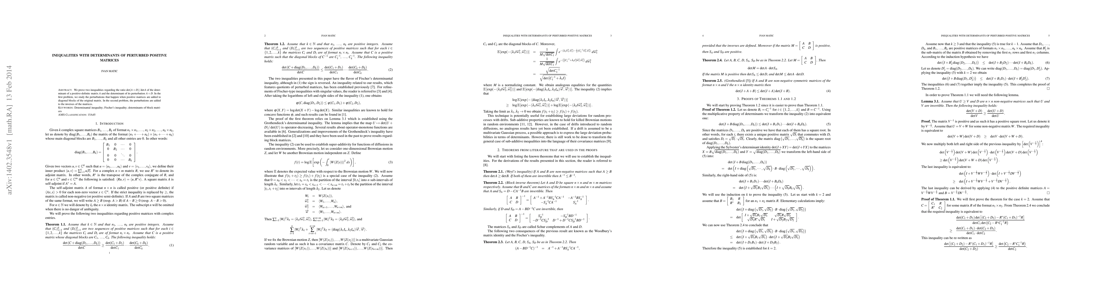We prove two inequalities regarding the ratio $\det(A+D)/\det A$ of the determinant of a positive-definite matrix $A$ and the determinant of its perturbation $A+D$. In the first problem, we study the perturbations that happen when positive matrices are added to diagonal blocks of the original matrix. In the second problem, the perturbations are added to the inverses of the matrices.