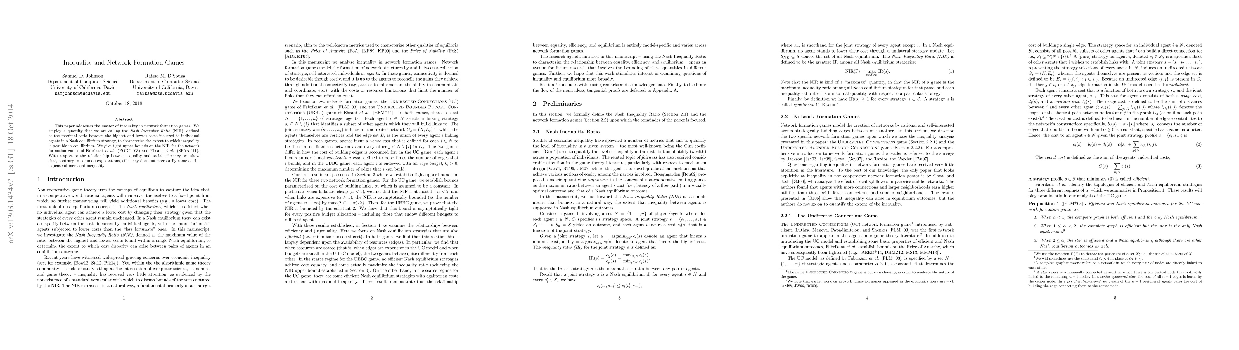 This paper studies inequality in network formation games, introducing a measure called the Nash Inequality Ratio (NIR) to quantify its extent. It shows that efficiency doesn't necessarily come at the cost of increased inequality.