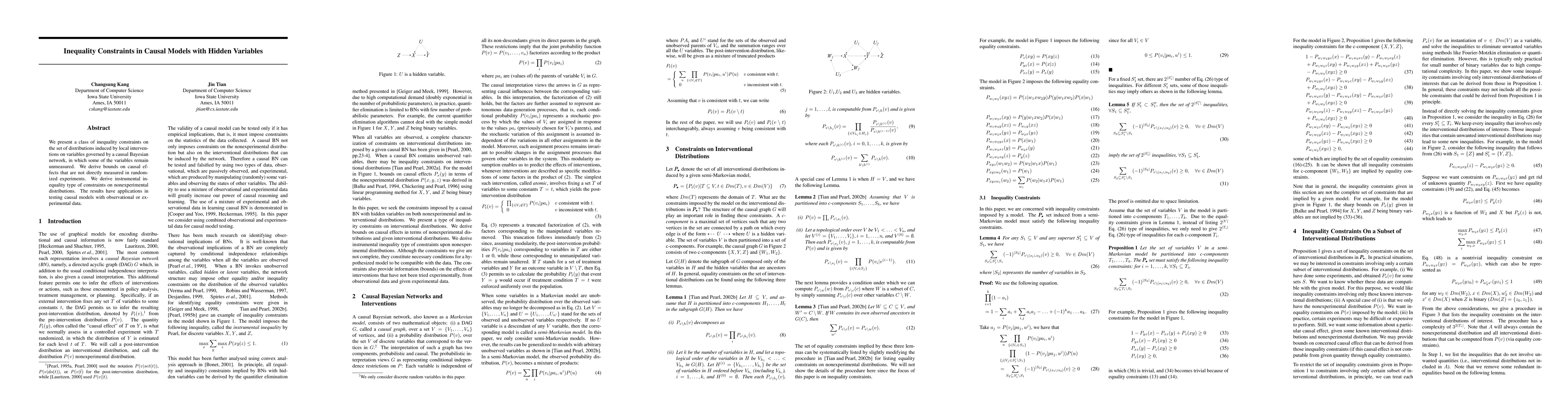 The paper introduces a method to derive inequality constraints on interventional distributions in causal Bayesian networks with hidden variables, which can be used to test causal models and bound causal effects.