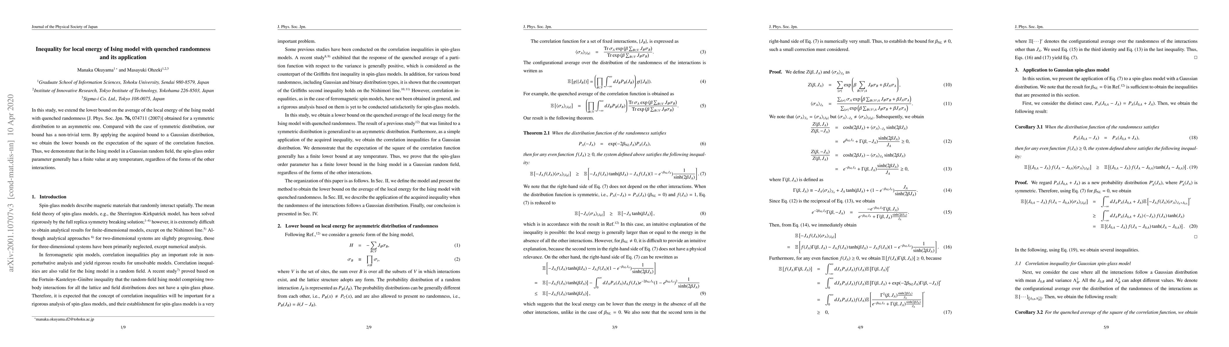 This paper extends the lower bound on the average local energy of the Ising model with quenched randomness to asymmetric distributions, introducing a non-trivial term. The derived bound for a Gaussian distribution provides lower bounds on the expectation of the square of the correlation function, showing that the spin-glass order parameter remains finite at any temperature in the Ising model with Gaussian random fields.