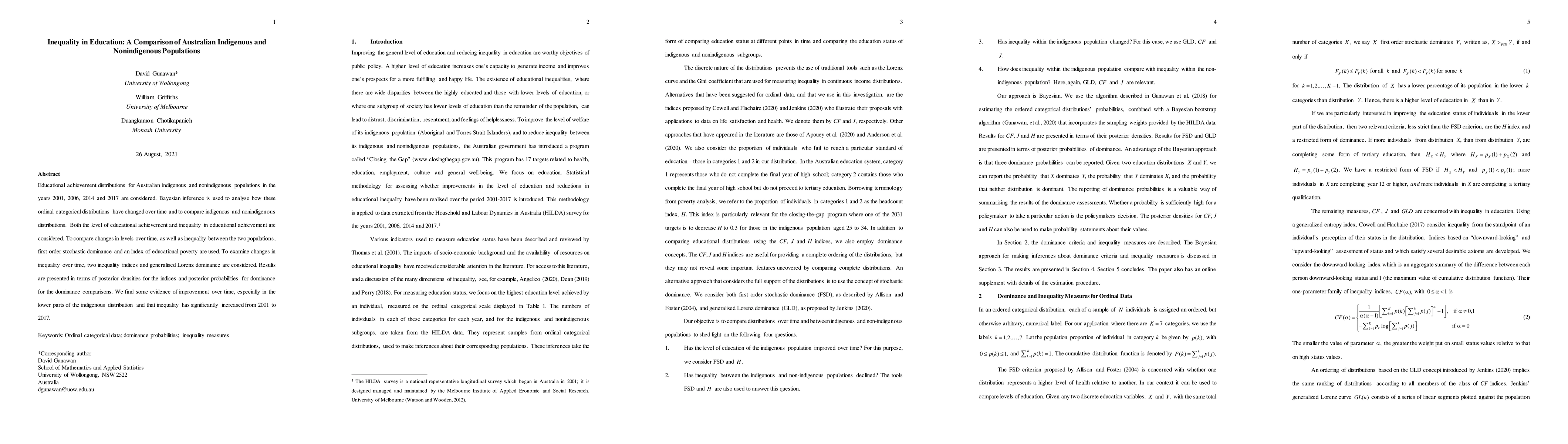 This paper uses Bayesian inference to analyze educational achievement distributions for Australian Indigenous and nonindigenous populations from 2001 to 2017, finding some improvement over time, particularly in the lower parts of the Indigenous distribution, while noting a significant increase in inequality from 2001 to 2017.