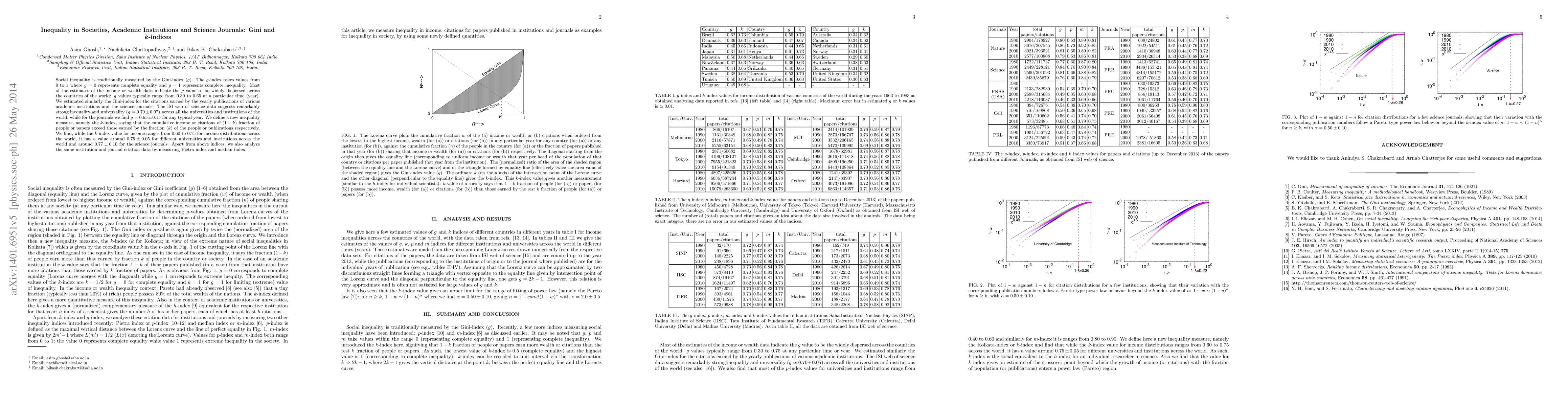 This paper examines social inequality using Gini-index and introduces a new $k$-index to measure inequality in academic institutions and science journals. It finds significant inequality in global academic citations, with Gini-index values around $0.70$ for universities and $0.65$ for journals, and $k$-index values around $0.75$ for institutions and $0.77$ for journals.