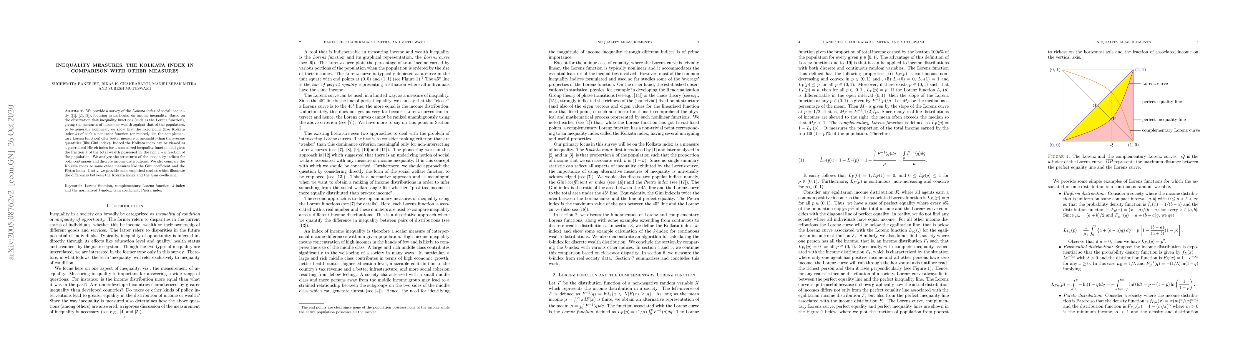 We provide a survey of the Kolkata index of social inequality, focusing in particular on income inequality. Based on the observation that inequality functions (such as the Lorenz function), giving the measures of income or wealth against that of the population, to be generally nonlinear, we show that the fixed point (like Kolkata index k) of such a nonlinear function (or related, like the complementary Lorenz function) offer better measure of inequality than the average quantities (like Gini index). Indeed the Kolkata index can be viewed as a generalized Hirsch index for a normalized inequality function and gives the fraction k of the total wealth possessed by the rich (1-k) fraction of the population. We analyze the structures of the inequality indices for both continuous and discrete income distributions. We also compare the Kolkata index to some other measures like the Gini coefficient and the Pietra index. Lastly, we provide some empirical studies which illustrate the differences between the Kolkata index and the Gini coefficient.