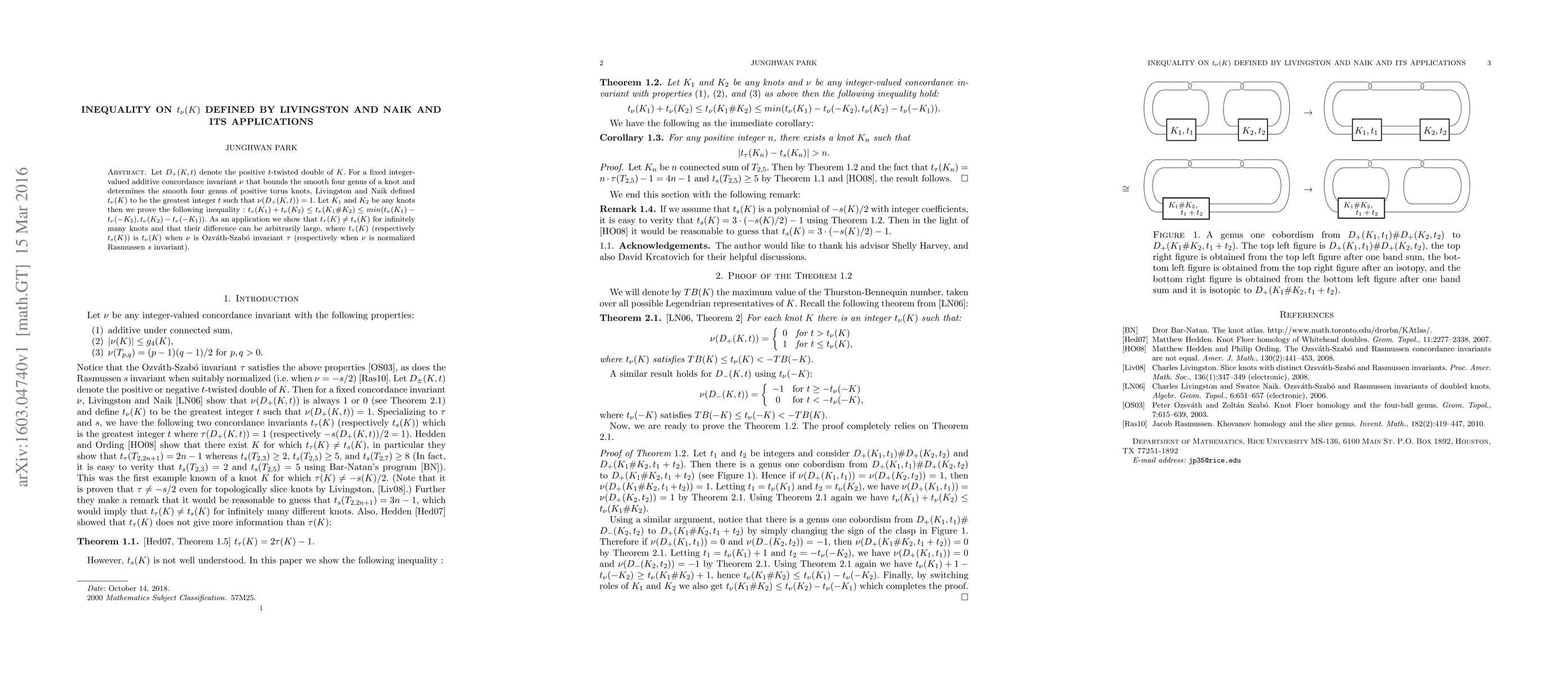 Let $D_+(K,t)$ denote the positive $t$-twisted double of $K$. For a fixed integer-valued additive concordance invariant $\nu$ that bounds the smooth four genus of a knot and determines the smooth four genus of positive torus knots, Livingston and Naik defined $t_\nu(K)$ to be the greatest integer $t$ such that $\nu(D_+(K,t)) = 1$. Let $K_1$ and $K_2$ be any knots then we prove the following inequality : $t_\nu(K_1) + t_\nu(K_2) \leq t_\nu(K_1 \# K_2) \leq min(t_\nu(K_1) - t_\nu(-K_2), t_\nu(K_2) - t_\nu(-K_1)).$ As an application we show that $t_\tau(K) \neq t_s(K)$ for infinitely many knots and that their difference can be arbitrarily large, where $t_\tau(K)$ (respectively $t_s(K)$) is $t_\nu(K)$ when $\nu$ is Ozv\'{a}th-Szab\'{o} invariant $\tau$ (respectively when $\nu$ is normalized Rasmussen $s$ invariant).
