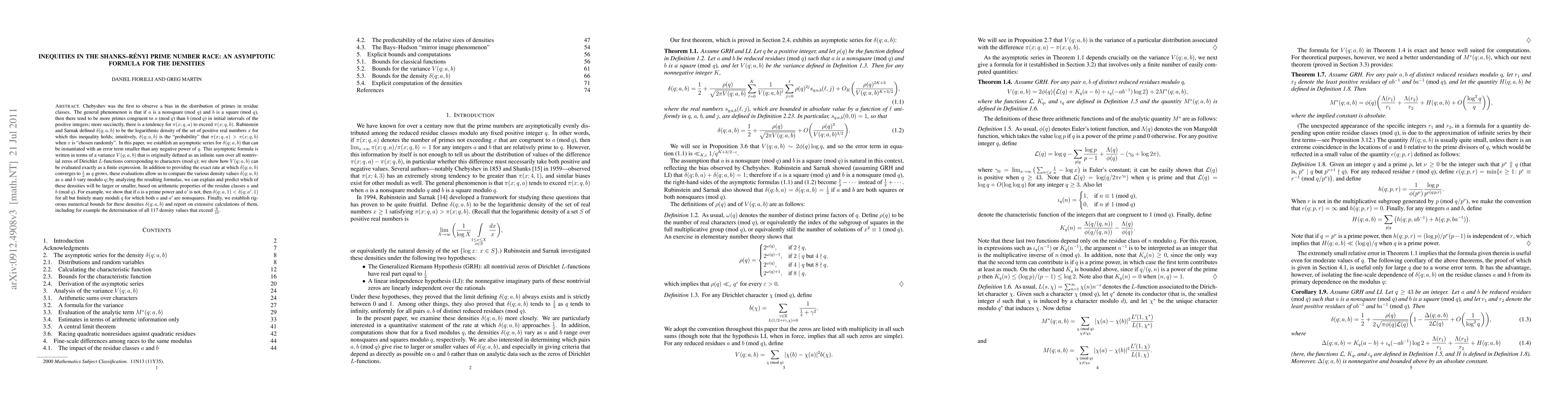 Chebyshev was the first to observe a bias in the distribution of primes in residue classes. The general phenomenon is that if $a$ is a nonsquare\mod q and $b$ is a square\mod q, then there tend to be more primes congruent to $a\mod q$ than $b\mod q$ in initial intervals of the positive integers; more succinctly, there is a tendency for $\pi(x;q,a)$ to exceed $\pi(x;q,b)$. Rubinstein and Sarnak defined $\delta(q;a,b)$ to be the logarithmic density of the set of positive real numbers $x$ for which this inequality holds; intuitively, $\delta(q;a,b)$ is the "probability" that $\pi(x;q,a) > \pi(x;q,b)$ when $x$ is "chosen randomly". In this paper, we establish an asymptotic series for $\delta(q;a,b)$ that can be instantiated with an error term smaller than any negative power of $q$. This asymptotic formula is written in terms of a variance $V(q;a,b)$ that is originally defined as an infinite sum over all nontrivial zeros of Dirichlet $L$-functions corresponding to characters\mod q; we show how $V(q;a,b)$ can be evaluated exactly as a finite expression. In addition to providing the exact rate at which $\delta(q;a,b)$ converges to $\frac12$ as $q$ grows, these evaluations allow us to compare the various density values $\delta(q;a,b)$ as $a$ and $b$ vary modulo $q$; by analyzing the resulting formulas, we can explain and predict which of these densities will be larger or smaller, based on arithmetic properties of the residue classes $a$ and $b\mod q$. For example, we show that if $a$ is a prime power and $a'$ is not, then $\delta(q;a,1) < \delta(q;a',1)$ for all but finitely many moduli $q$ for which both $a$ and $a'$ are nonsquares. Finally, we establish rigorous numerical bounds for these densities $\delta(q;a,b)$ and report on extensive calculations of them.