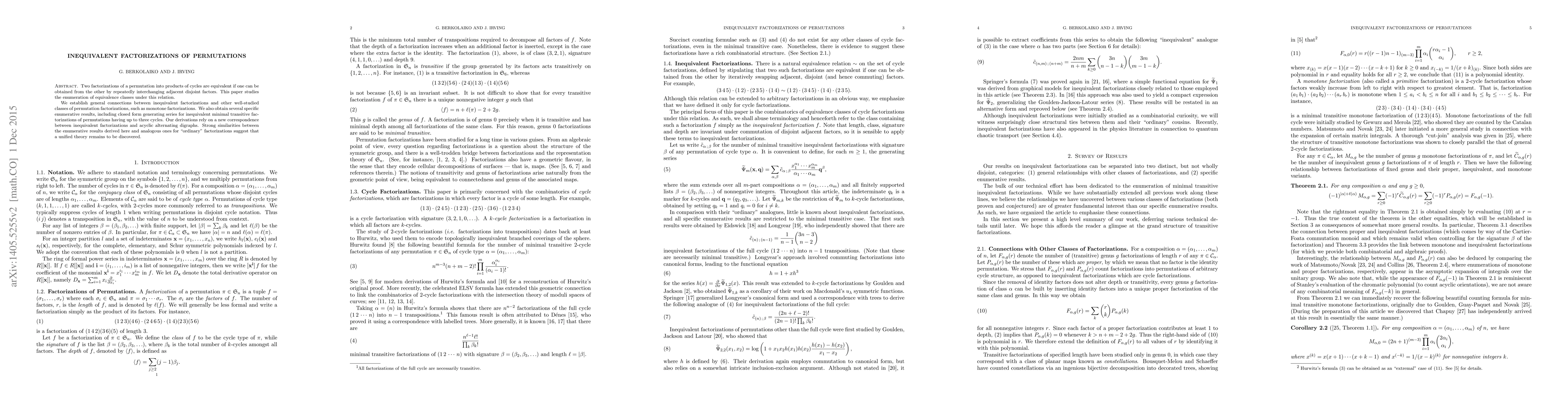 This paper enumerates equivalence classes of factorizations of permutations into cycles, focusing on minimal transitive factorizations. It establishes closed form expressions for generating series of inequivalent factorizations for permutations with up to three cycles and restricted four-cycle permutations, using a new correspondence with acyclic alternating digraphs.