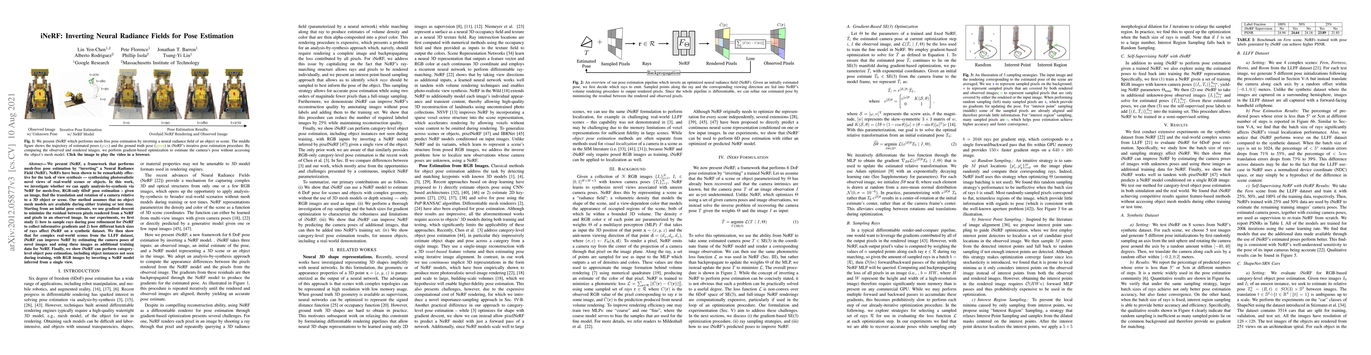 The paper introduces iNeRF, a framework for mesh-free 6DoF pose estimation by inverting Neural Radiance Fields (NeRF) to estimate the camera's translation and rotation relative to a 3D object or scene from an RGB image. The method refines initial pose estimates using gradient descent to minimize the difference between rendered and observed pixels, demonstrating improvements on synthetic and real-world datasets.