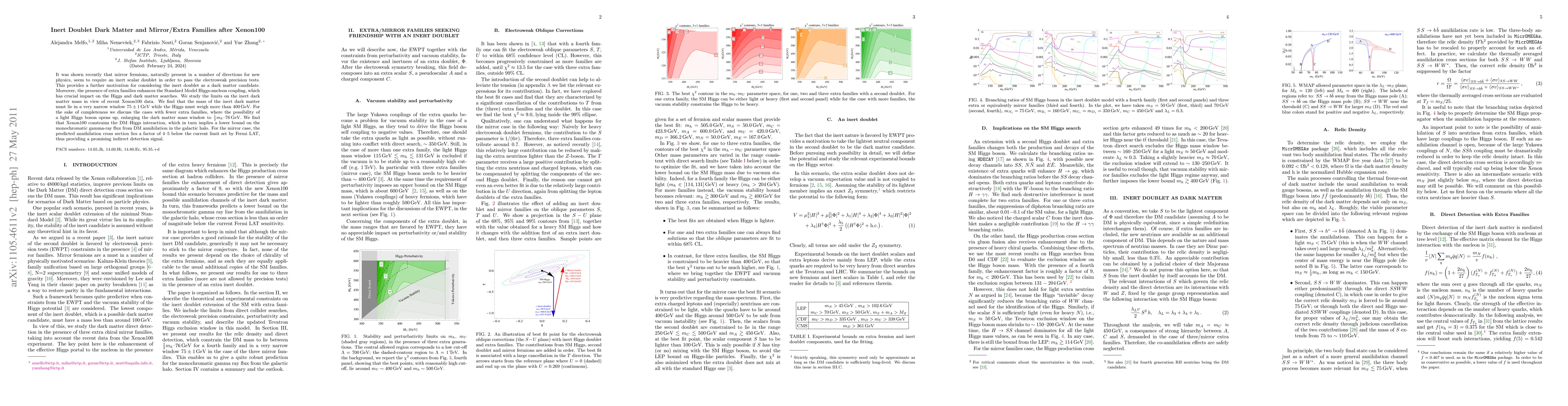 The paper explores Inert Doublet Dark Matter in the context of mirror or extra families, finding that the dark matter mass must be narrowly around 74-76 GeV due to Xenon100 data. It also suggests a lower bound on the monochromatic gamma-ray flux from DM annihilation and predicts a lower indirect detection signal from Fermi LAT compared to current limits.