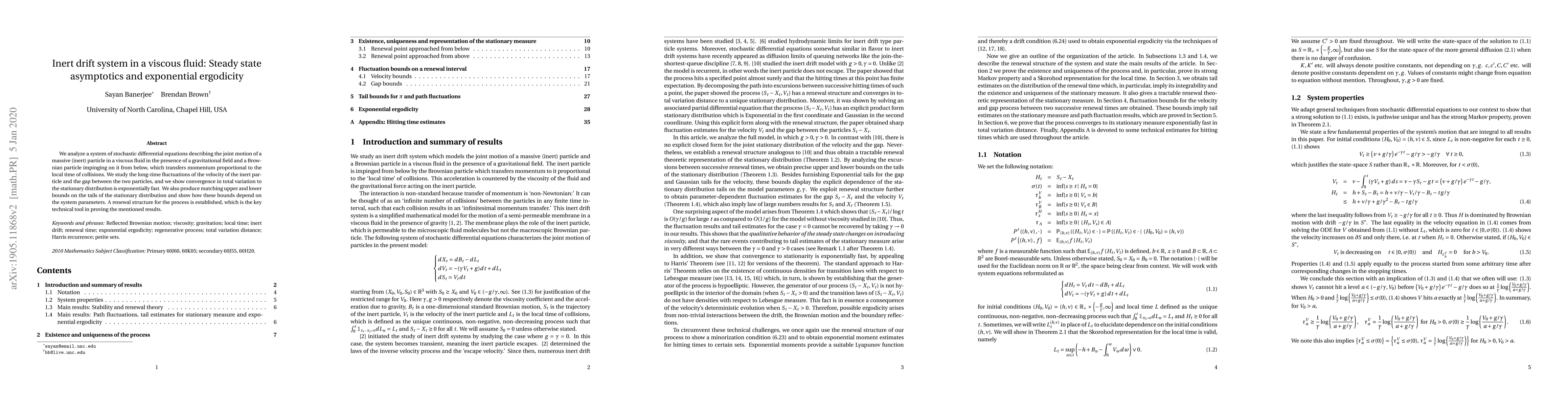 We analyze a system of stochastic differential equations describing the joint motion of a massive (inert) particle in a viscous fluid in the presence of a gravitational field and a Brownian particle impinging on it from below, which transfers momentum proportional to the local time of collisions. We study the long-time fluctuations of the velocity of the inert particle and the gap between the two particles, and we show convergence in total variation to the stationary distribution is exponentially fast. We also produce matching upper and lower bounds on the tails of the stationary distribution and show how these bounds depend on the system parameters. A renewal structure for the process is established, which is the key technical tool in proving the mentioned results.
