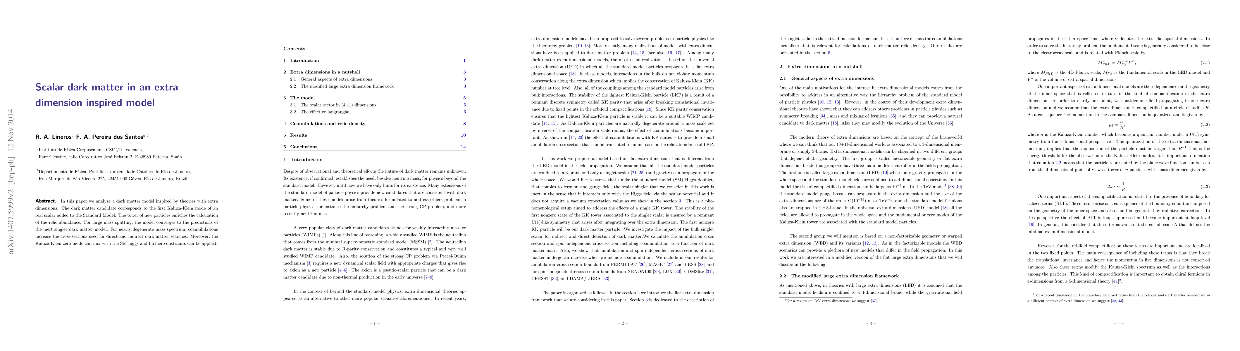 This paper proposes a dark matter model with a scalar particle in an extra dimension, where the first Kaluza-Klein mode serves as the dark matter candidate. The model's rich particle spectrum, including coannihilations for nearly degenerate masses, impacts relic abundance calculations. The model aligns with inert singlet dark matter for large mass splits. The Kaluza-Klein zero mode's potential mixing with the SM Higgs boson offers additional constraints for dark matter searches.