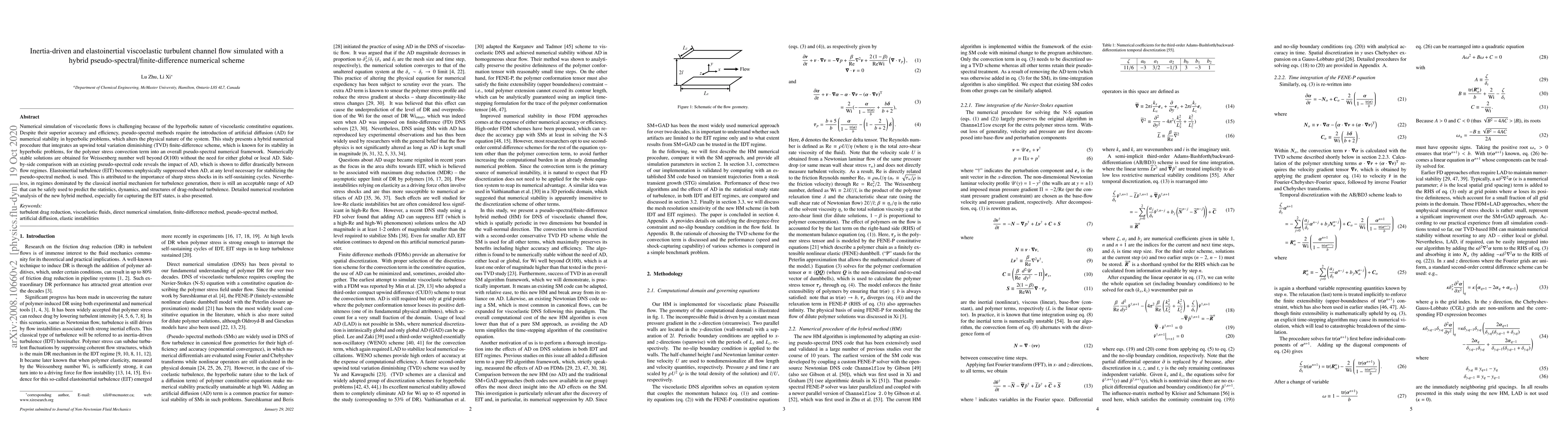 Numerical simulation of viscoelastic flows is challenging because of the hyperbolic nature of viscoelastic constitutive equations. Despite their superior accuracy and efficiency, pseudo-spectral methods require the introduction of artificial diffusion (AD) for numerical stability in hyperbolic problems, which alters the physical nature of the system. This study presents a hybrid numerical procedure that integrates an upwind total variation diminishing (TVD) finite-difference scheme, which is known for its stability in hyperbolic problems, for the polymer stress convection term into an overall pseudo-spectral numerical framework. Numerically stable solutions are obtained for Weissenberg number well beyond O(100) without the need for either global or local AD. Side-by-side comparison with an existing pseudo-spectral code reveals the impact of AD, which is shown to differ drastically between flow regimes. Elastoinertial turbulence (EIT) becomes unphysically suppressed when AD, at any level necessary for stabilizing the pseudo-spectral method, is used. This is attributed to the importance of sharp stress shocks in its self-sustaining cycles. Nevertheless , in regimes dominated by the classical inertial mechanism for turbulence generation, there is still an acceptable range of AD that can be safely used to predict the statistics, dynamics, and structures of drag-reduced turbulence. Detailed numerical resolution analysis of the new hybrid method, especially for capturing the EIT states, is also presented.